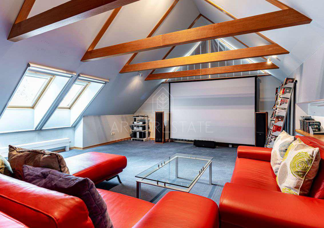 Дом состоит из двух зон. Левая зона жилая 3 этажа и цокольный этаж. Планировка: 1 этаж: холл-прихожая , санузел, кухня -столовая и гостиная с камином, котельная, гараж на 2 авто, 2 этаж: главная спальня, гардеробная, санузел, 2 спальни , ванная комната, мансарда: студия с спальней, санузел, цокольный этаж: сауна, зона отдыха с джакузи, санузел и душ, постирочная. Плюс правая сторона дома- свободного назначения (два этажа): 1 этаж: столовая и камин, 2 этаж: кабинет и кинотеатр.