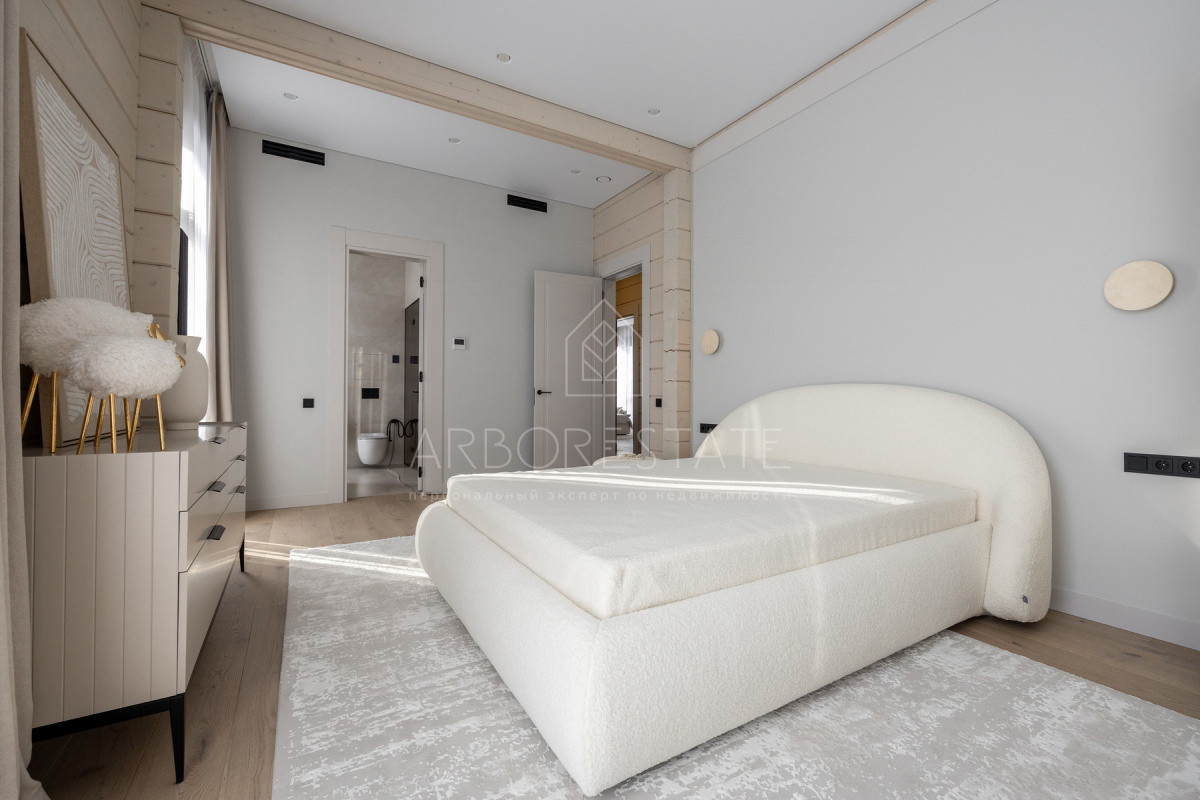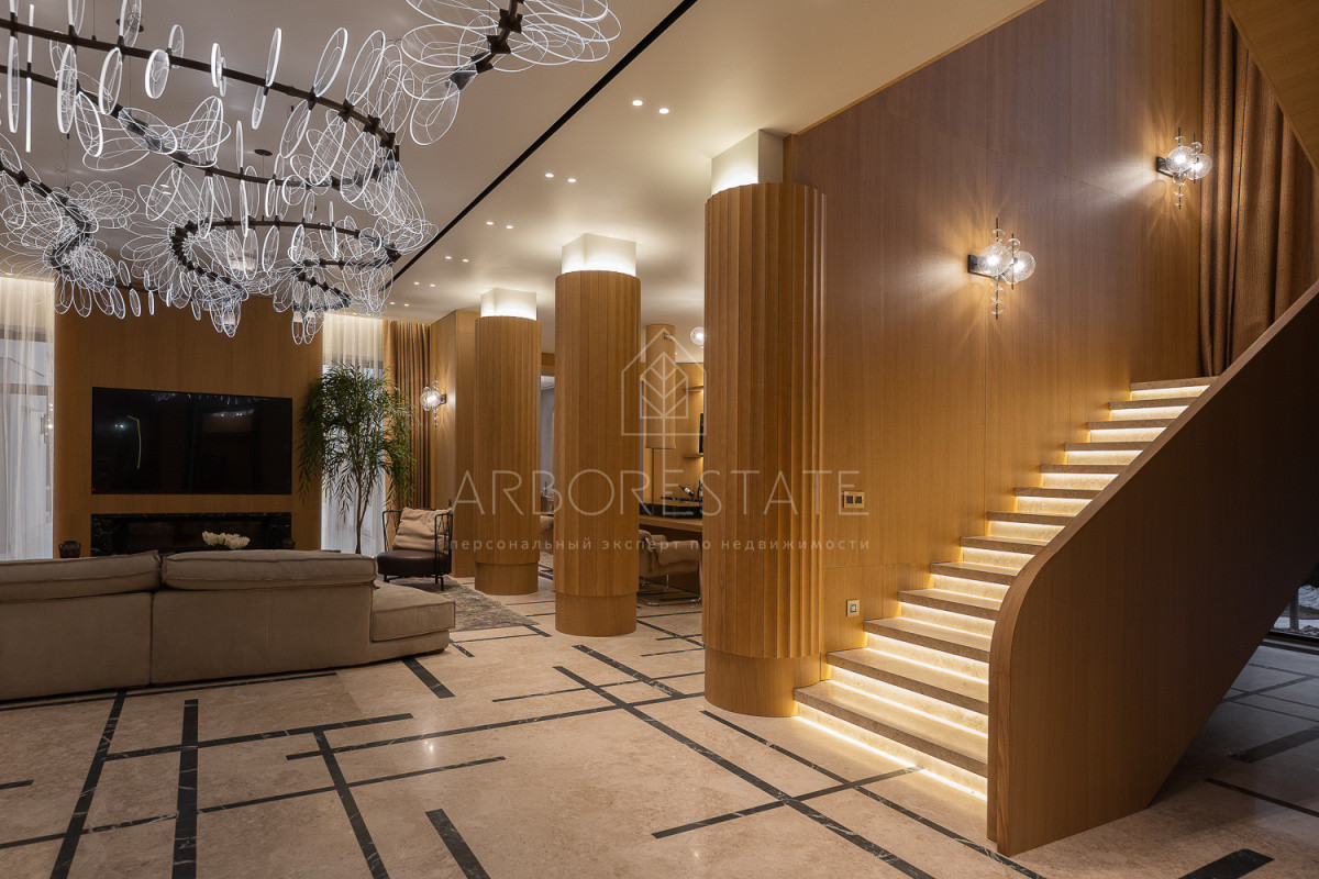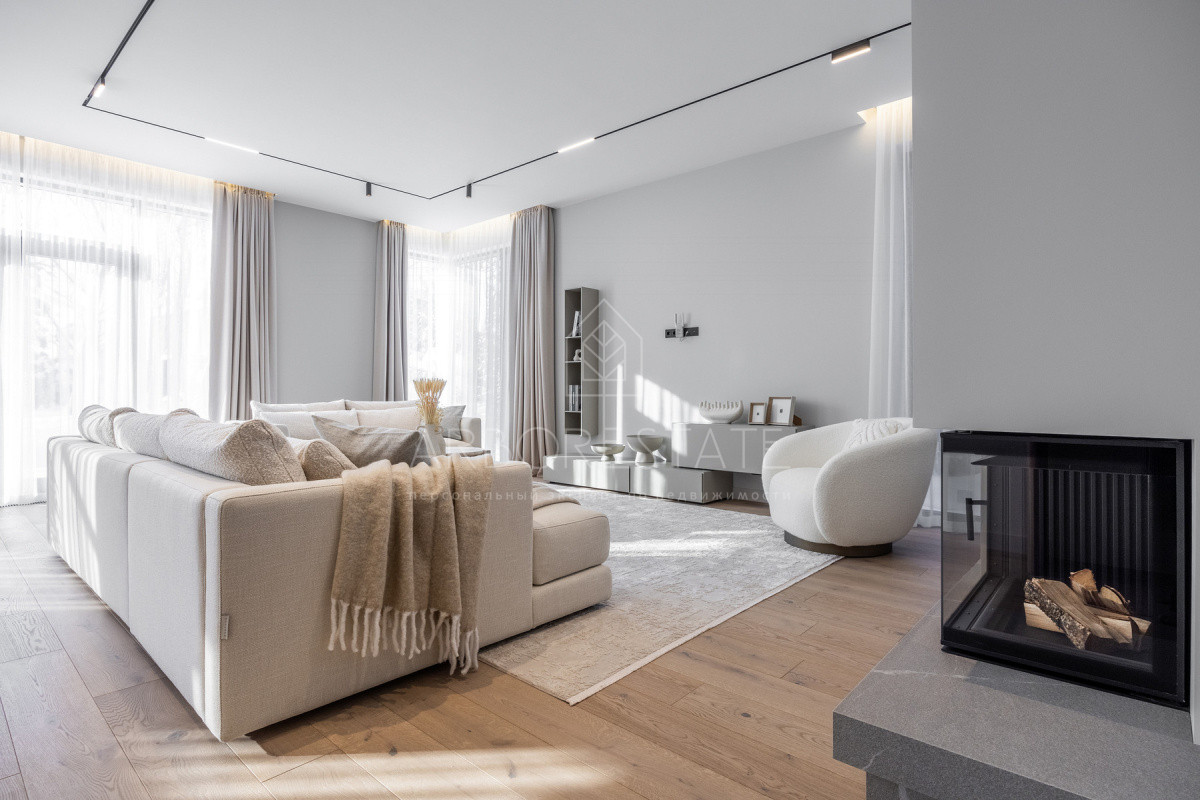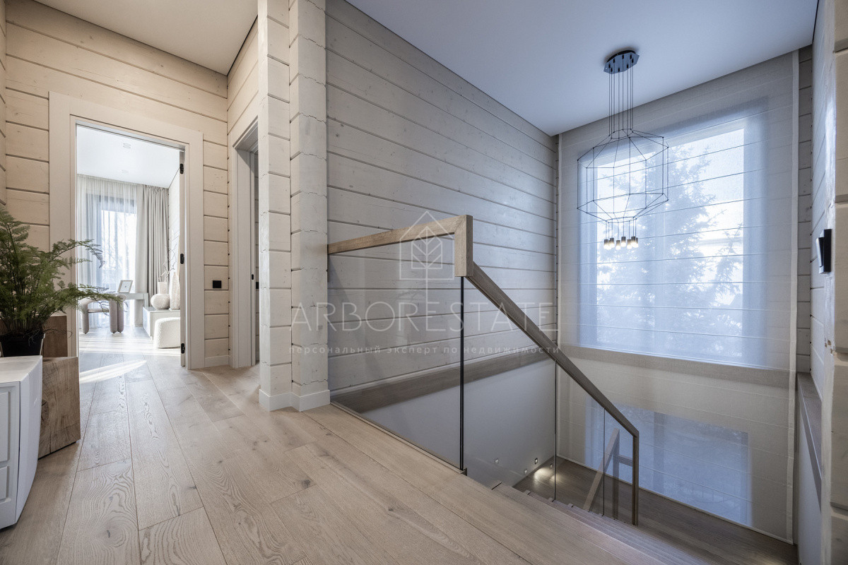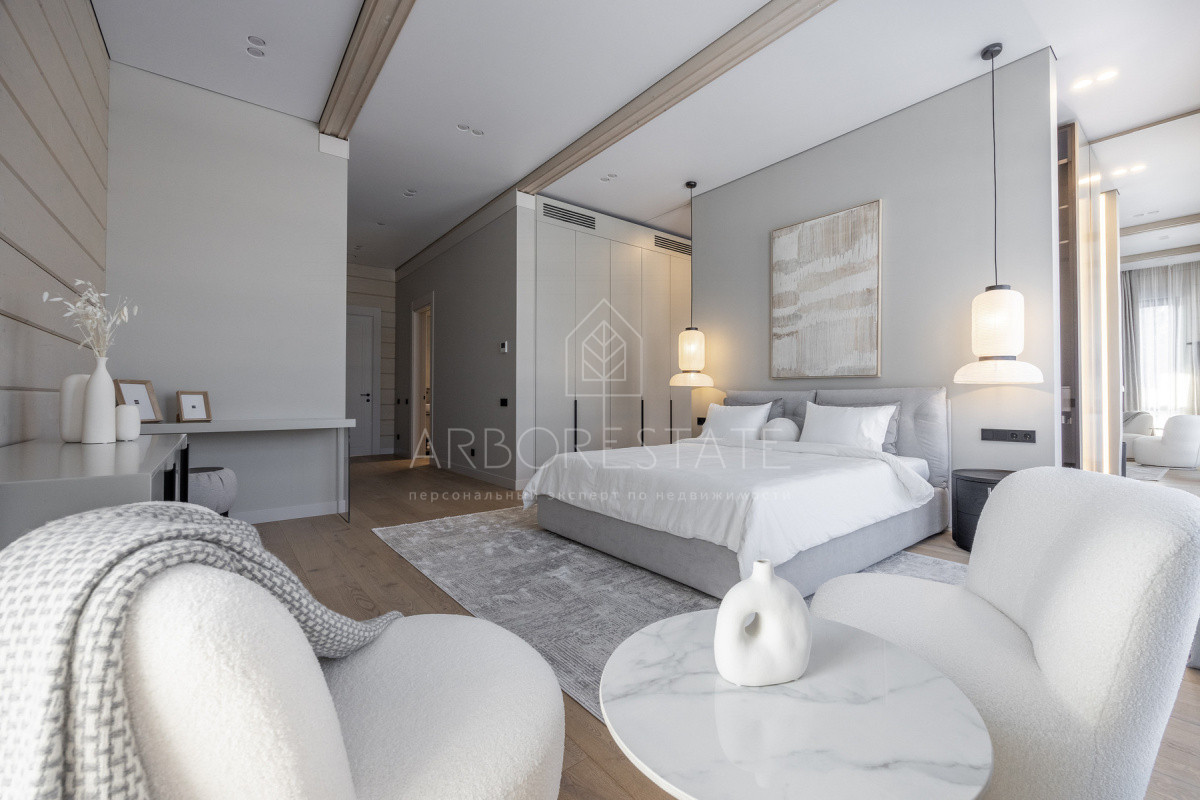 Внутреннее пространство организовано максимально функционально: большая гостиная с камином плавно перетекает в кухню и столовую, создавая единое пространство для общения и семейных ужинов. В доме — 6 уютных спален, 7 санузлов, удобные технические помещения и просторный гараж на 2 автомобиля.