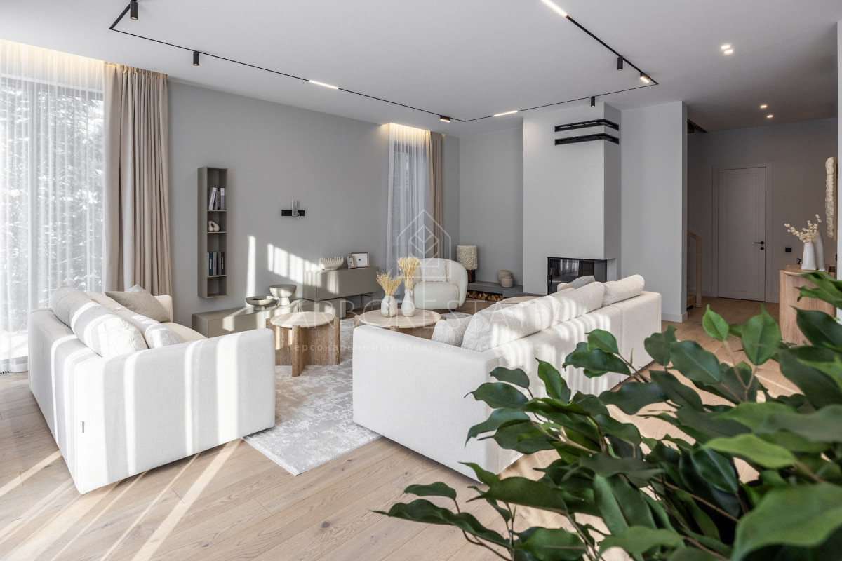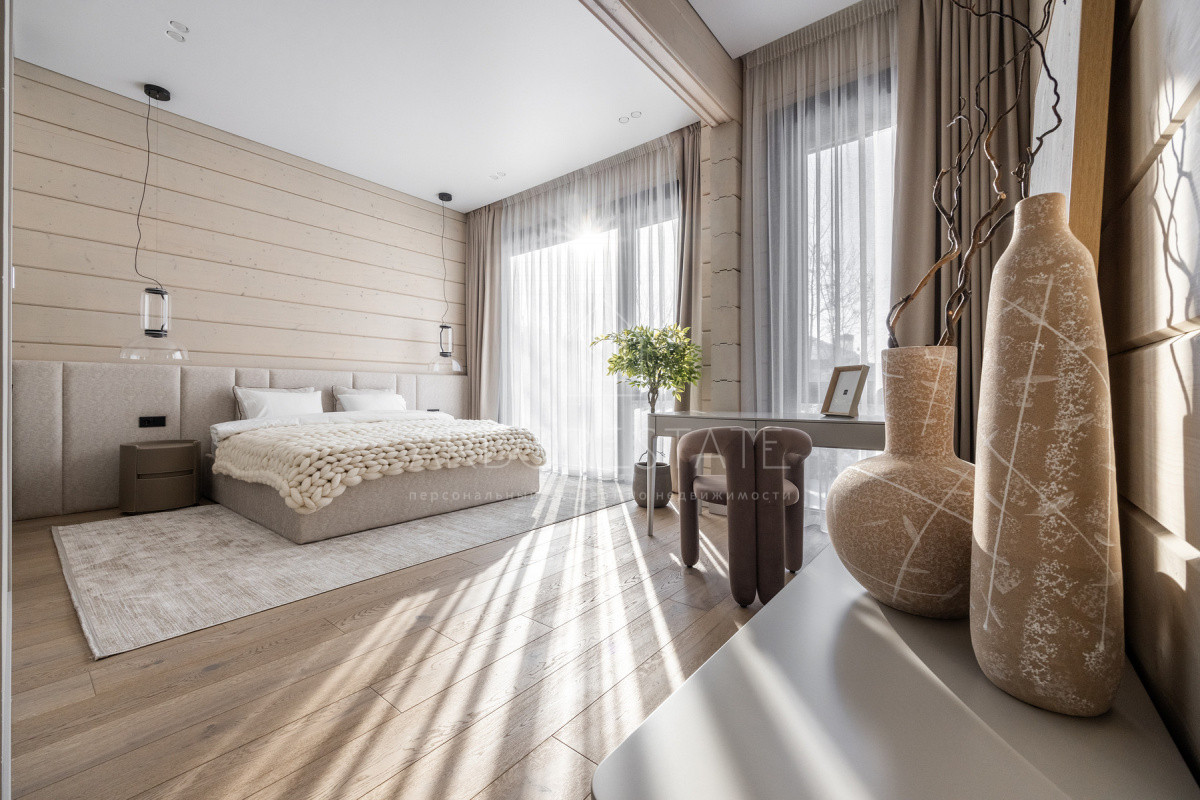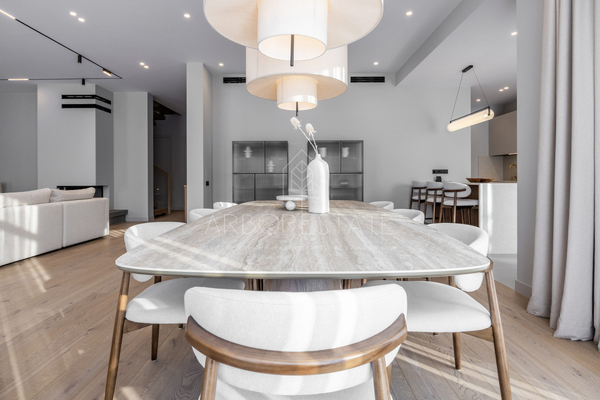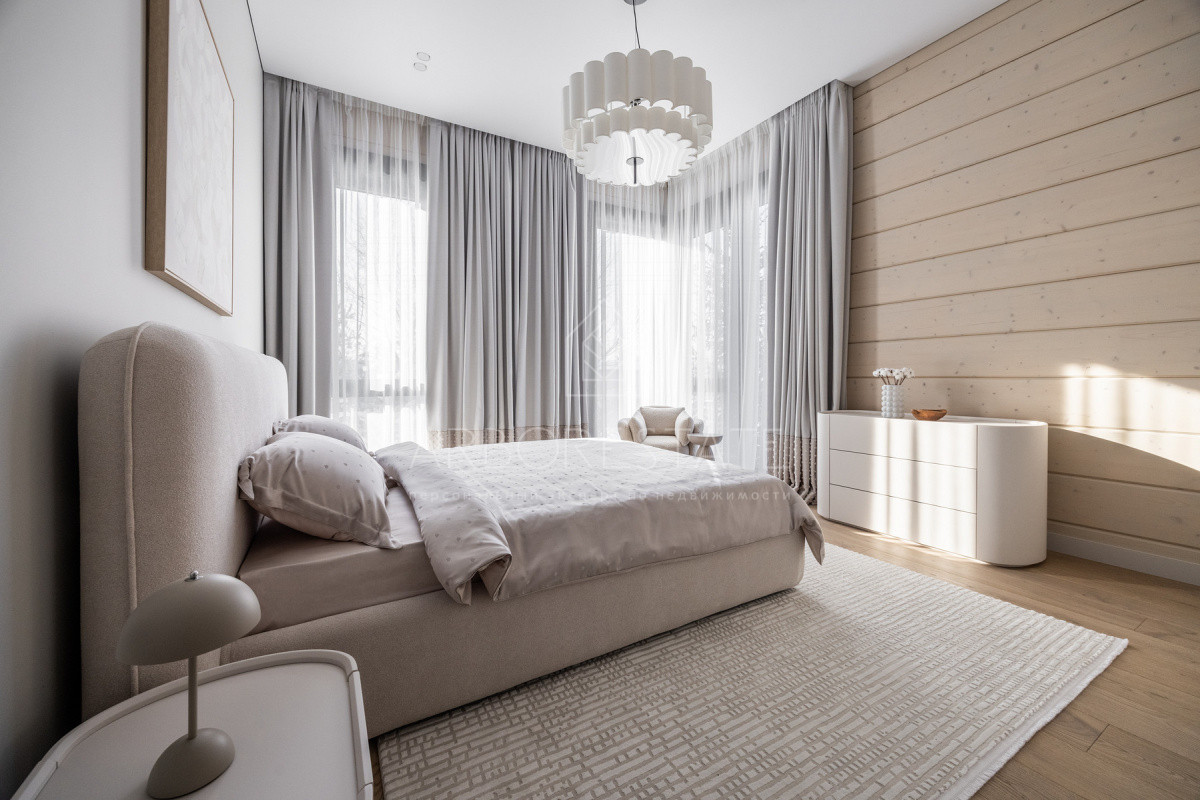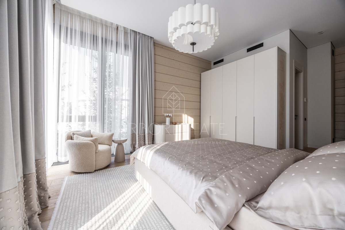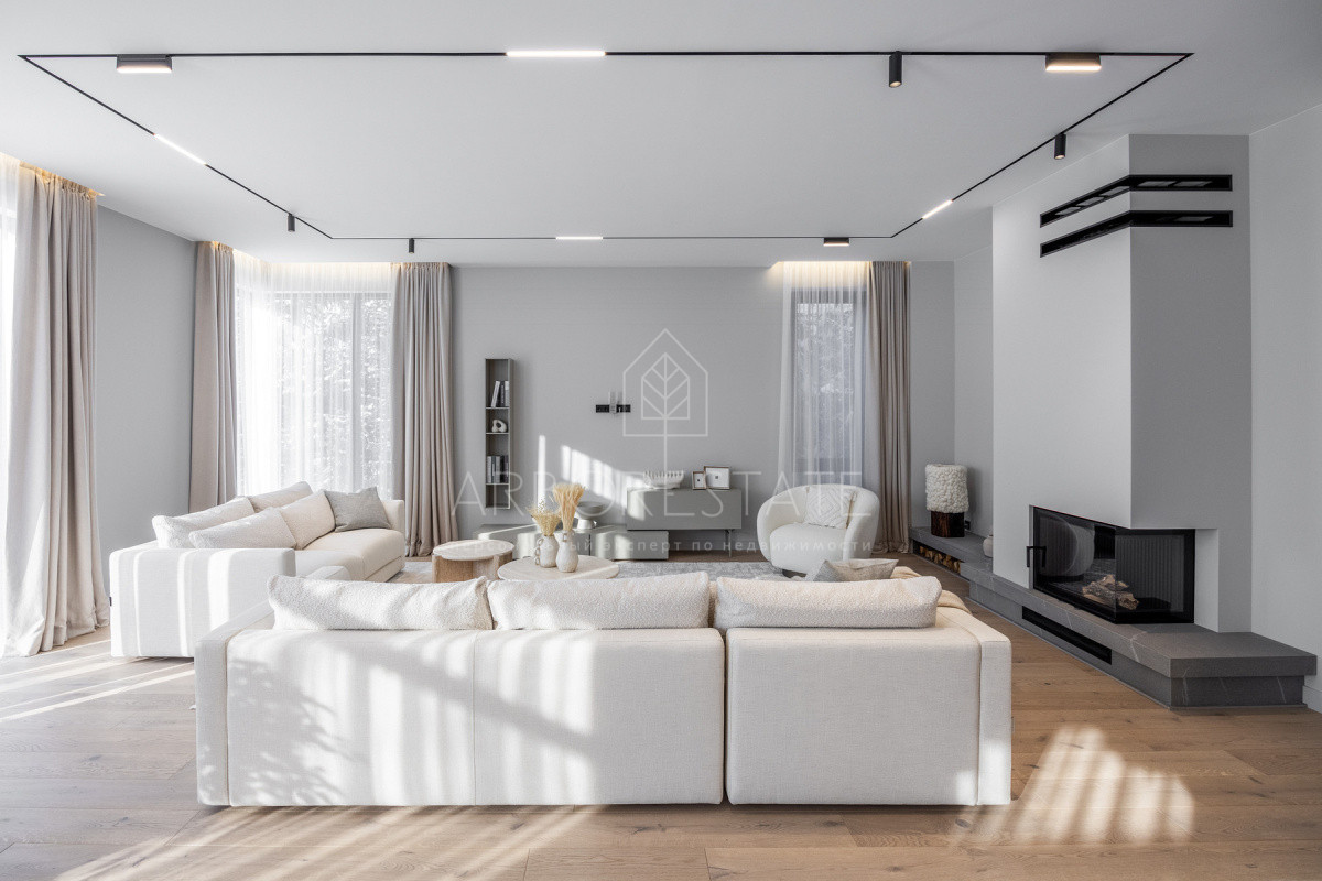 Внутреннее пространство организовано максимально функционально: большая гостиная с камином плавно перетекает в кухню и столовую, создавая единое пространство для общения и семейных ужинов. В доме — 6 уютных спален, 7 санузлов, удобные технические помещения и просторный гараж на 2 автомобиля.