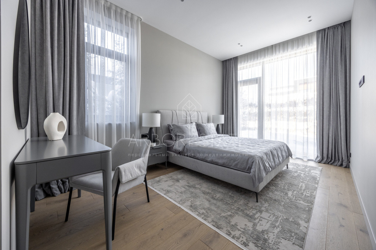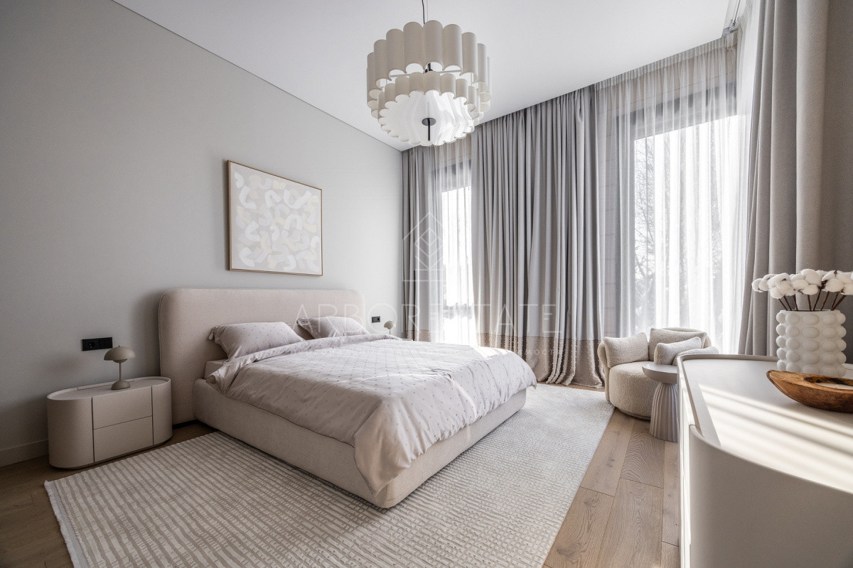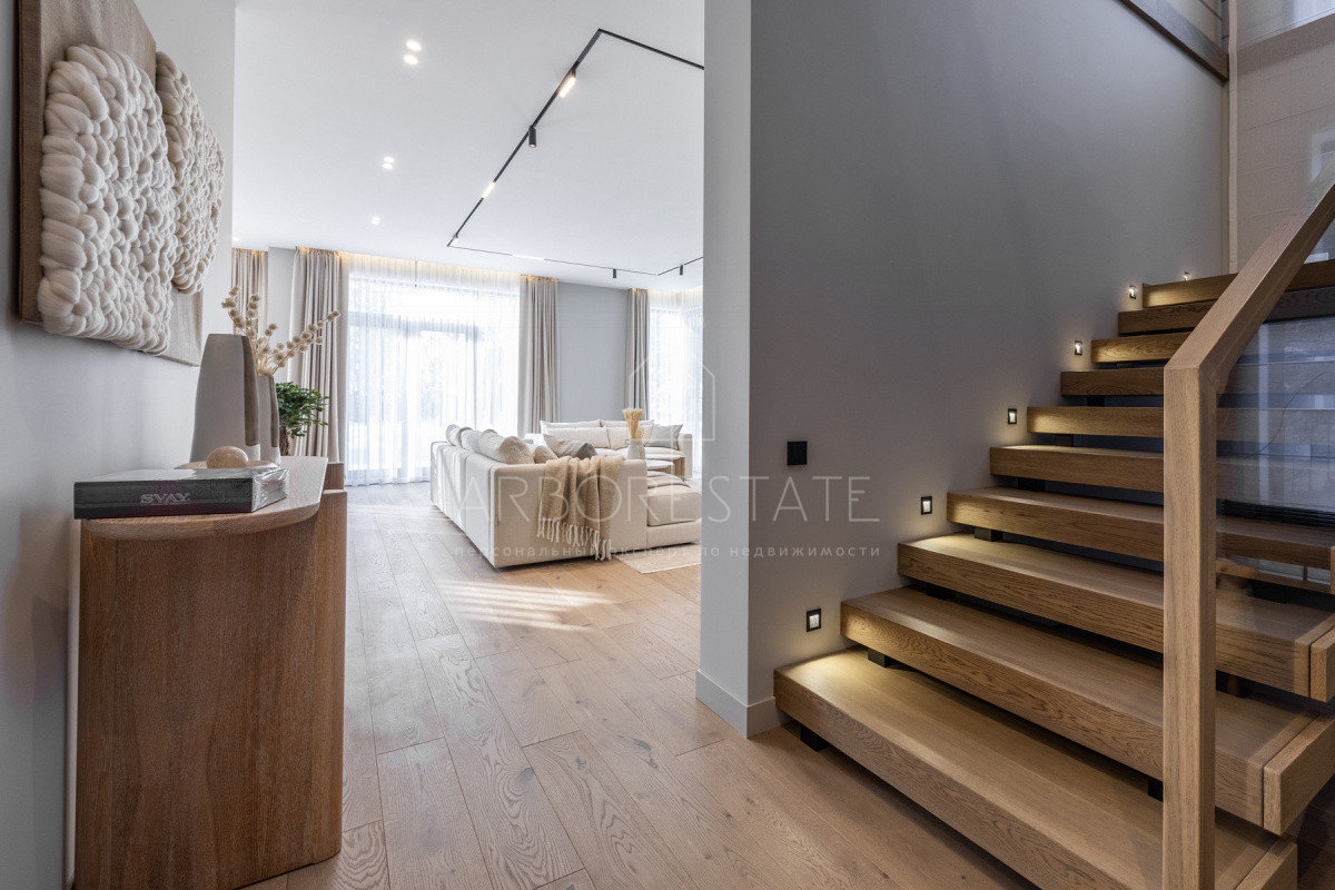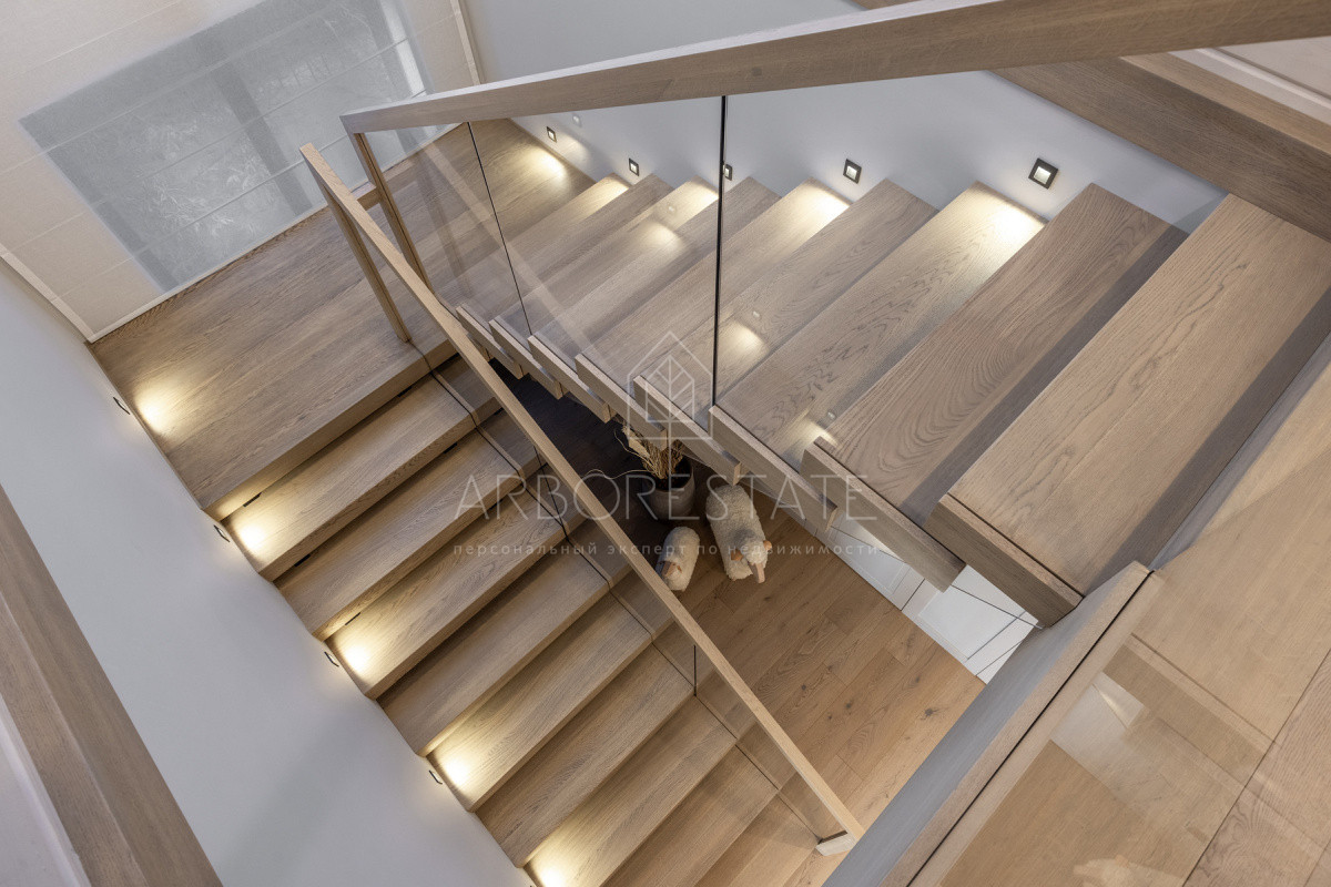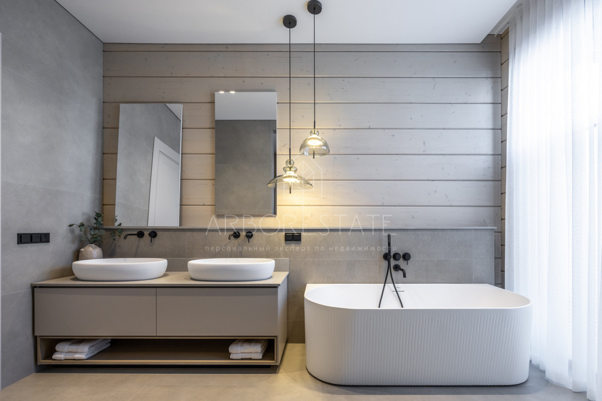 Внутреннее пространство организовано максимально функционально: большая гостиная с камином плавно перетекает в кухню и столовую, создавая единое пространство для общения и семейных ужинов. В доме — 6 уютных спален, 7 санузлов, удобные технические помещения и просторный гараж на 2 автомобиля.