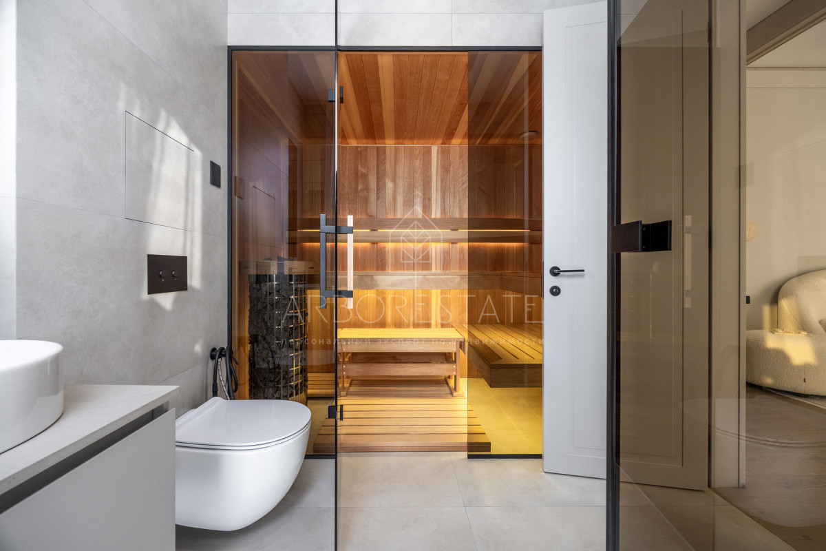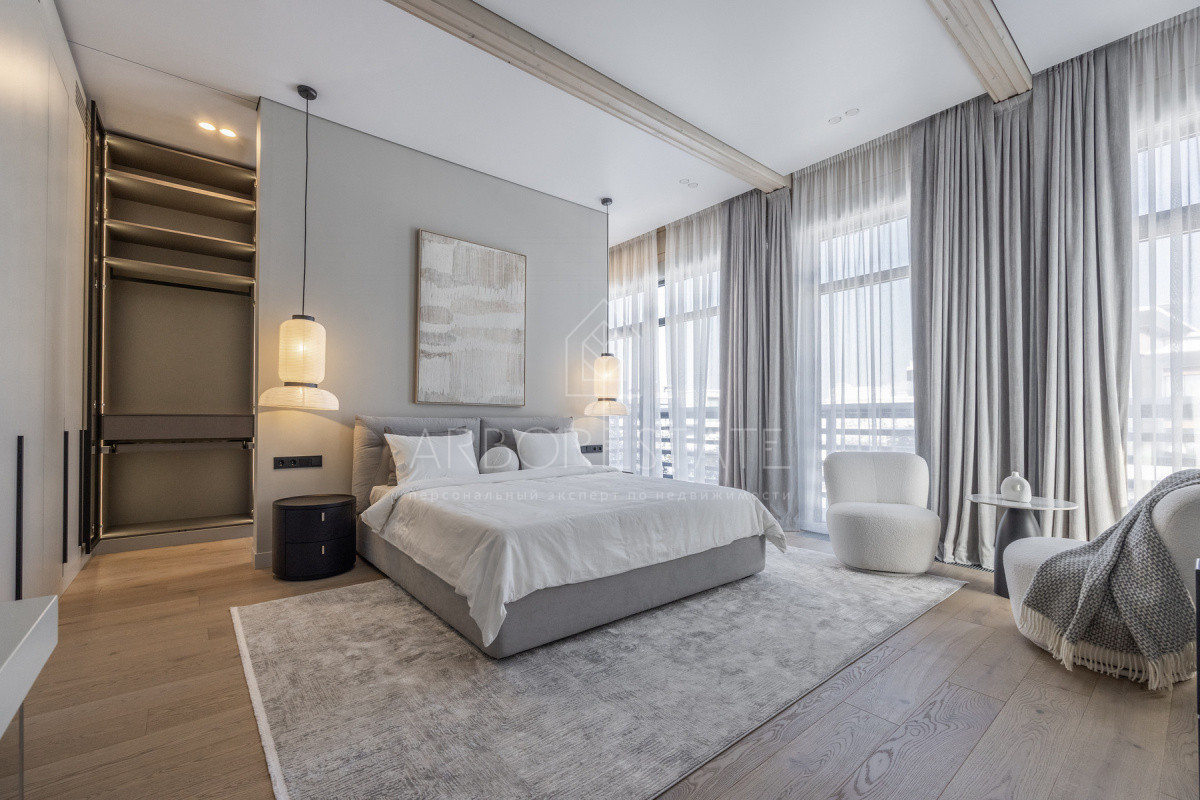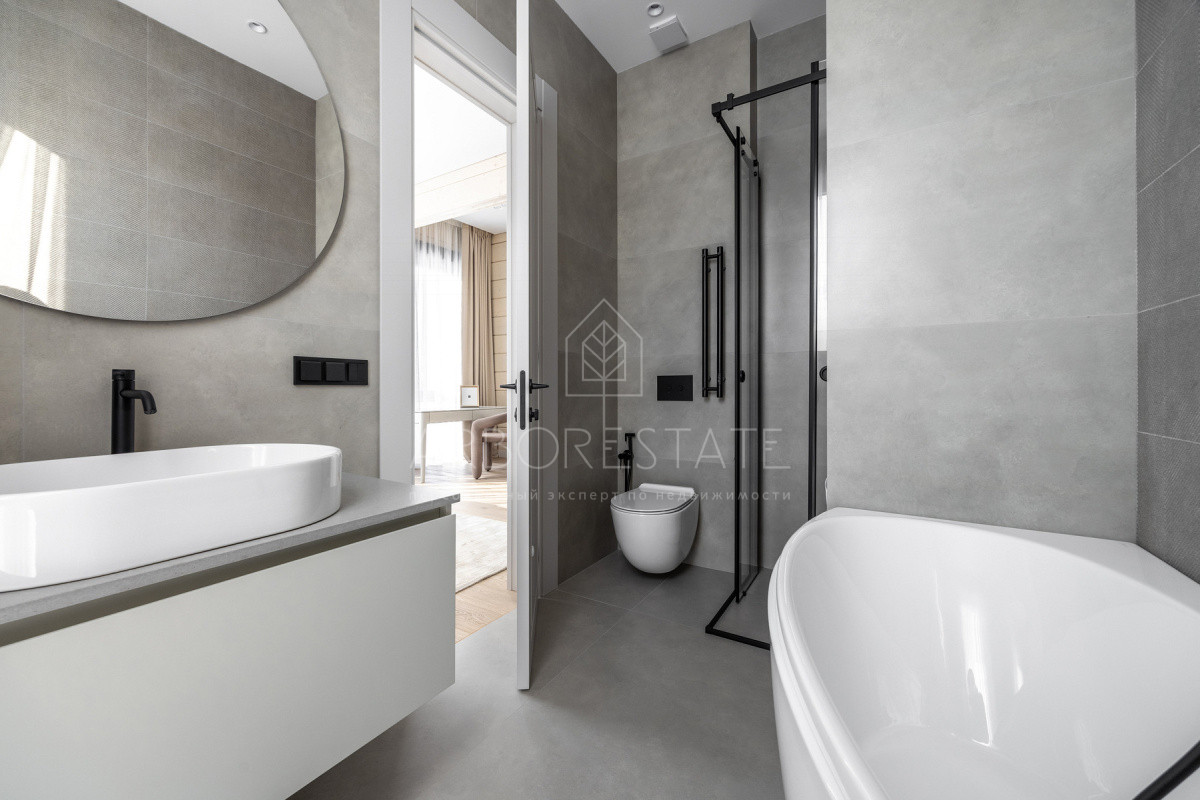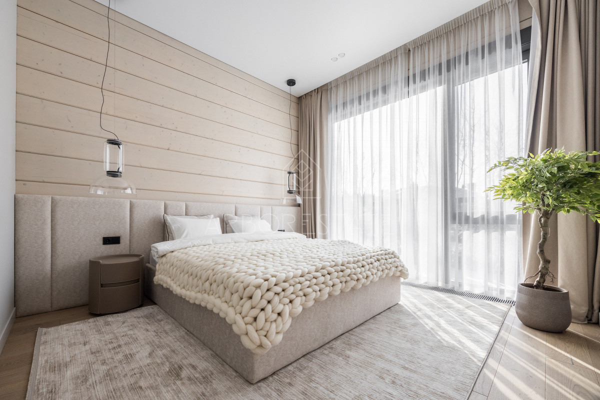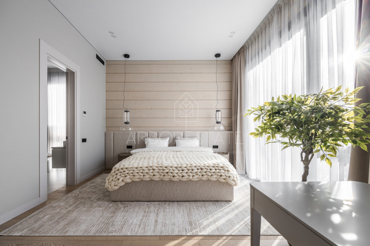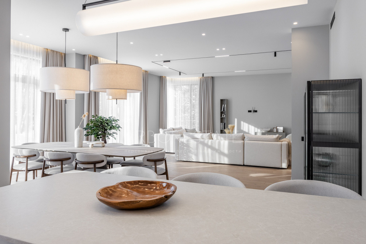 Внутреннее пространство организовано максимально функционально: большая гостиная с камином плавно перетекает в кухню и столовую, создавая единое пространство для общения и семейных ужинов. В доме — 6 уютных спален, 7 санузлов, удобные технические помещения и просторный гараж на 2 автомобиля.
