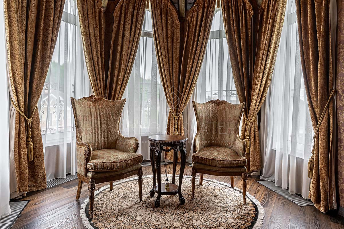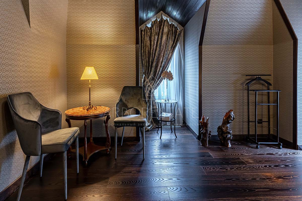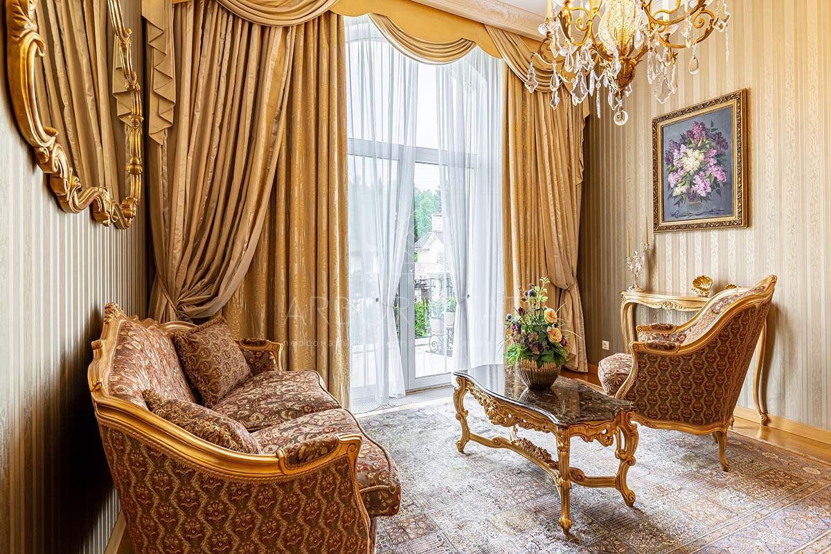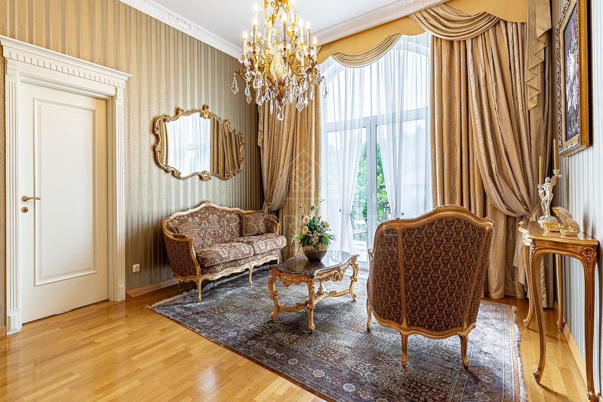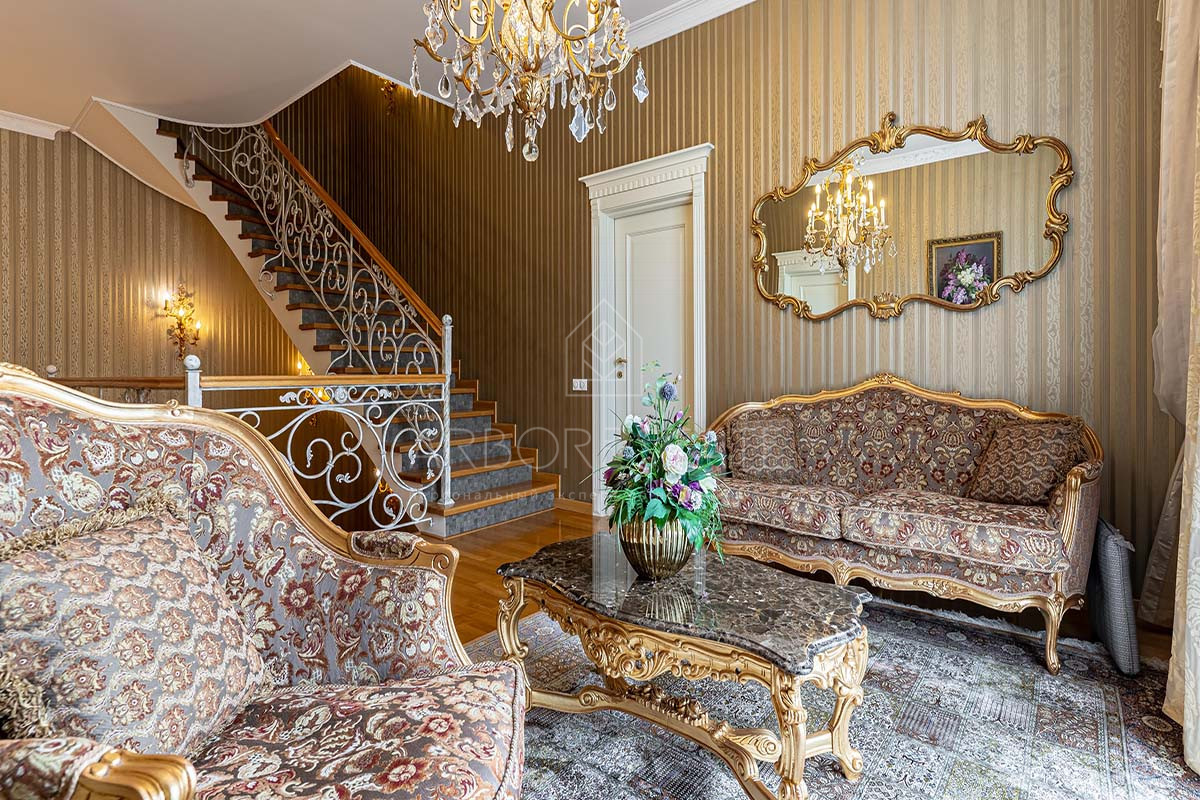 Шикарный интерьер дополнен изысканной мебелью и предметами декора. Большая площадь остекления и высокие потолки визуально увеличивают внутреннее пространство.