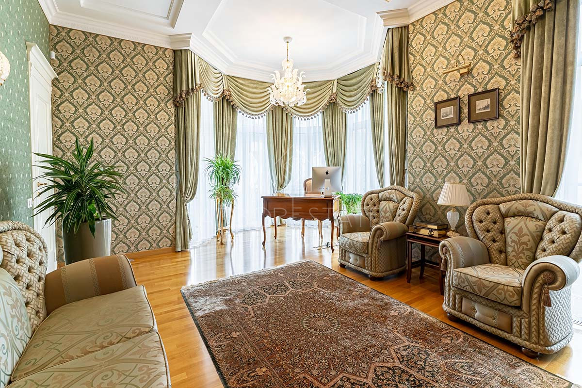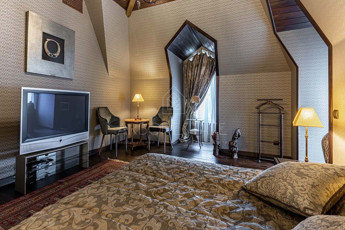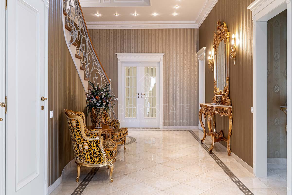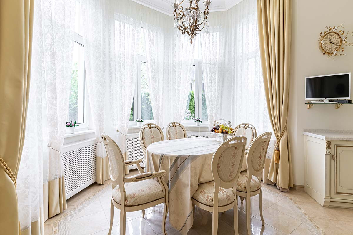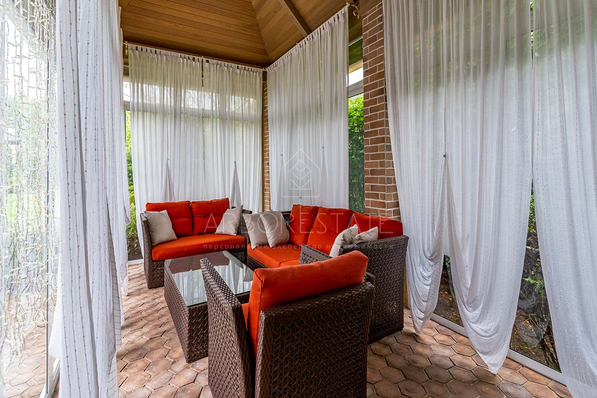 Шикарный интерьер дополнен изысканной мебелью и предметами декора. Большая площадь остекления и высокие потолки визуально увеличивают внутреннее пространство.