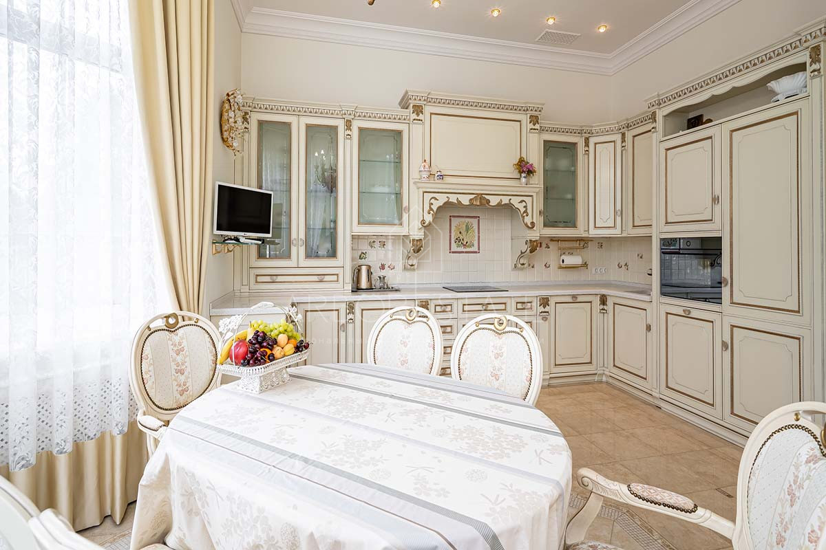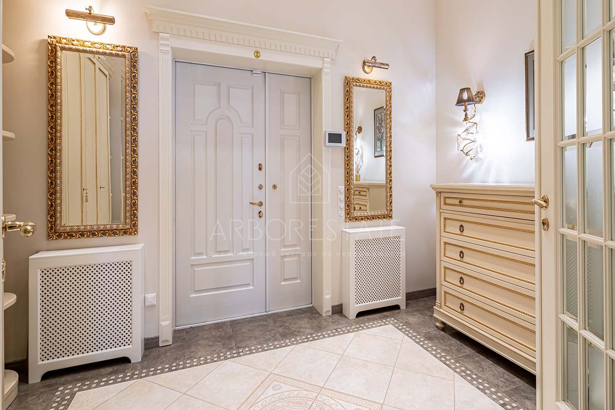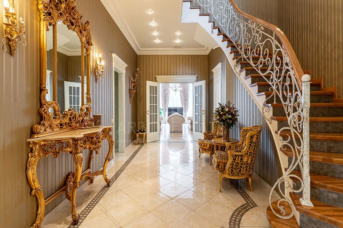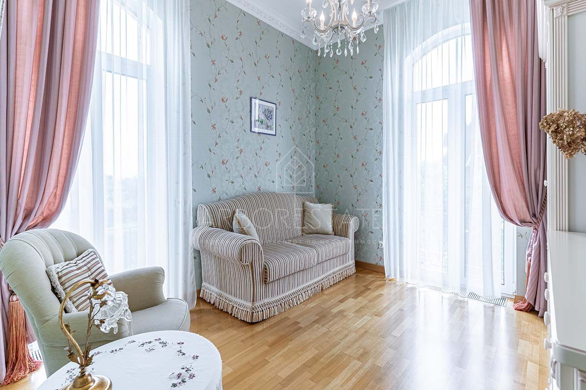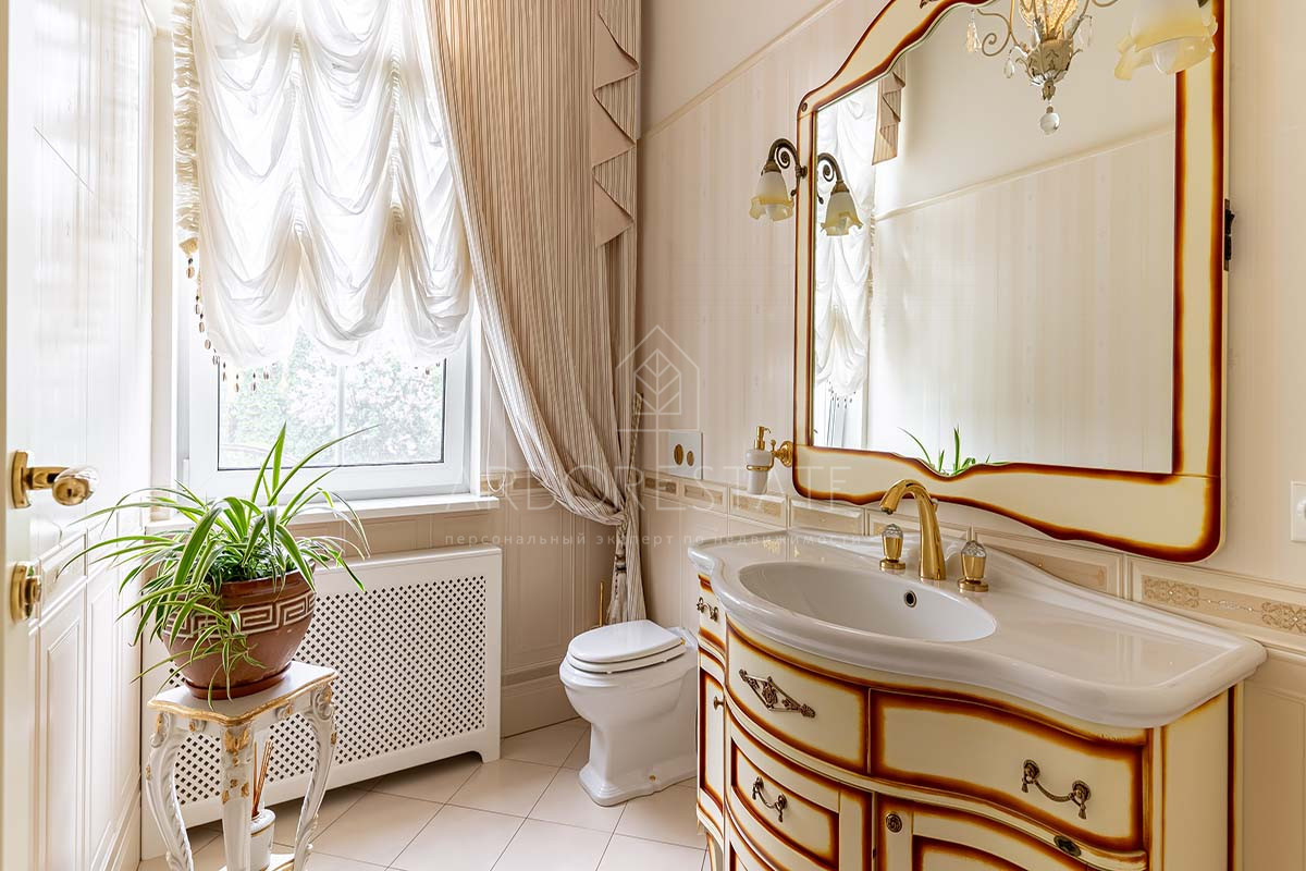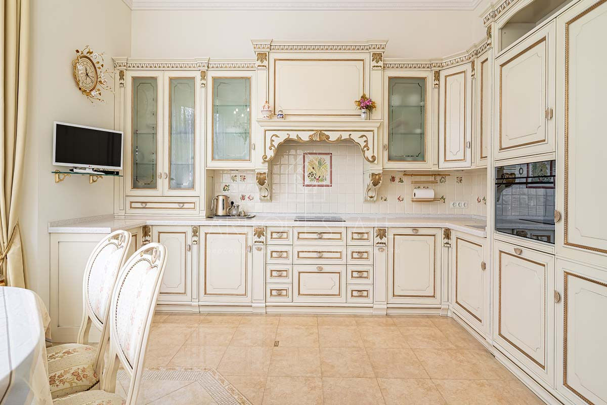 Шикарный интерьер дополнен изысканной мебелью и предметами декора. Большая площадь остекления и высокие потолки визуально увеличивают внутреннее пространство.