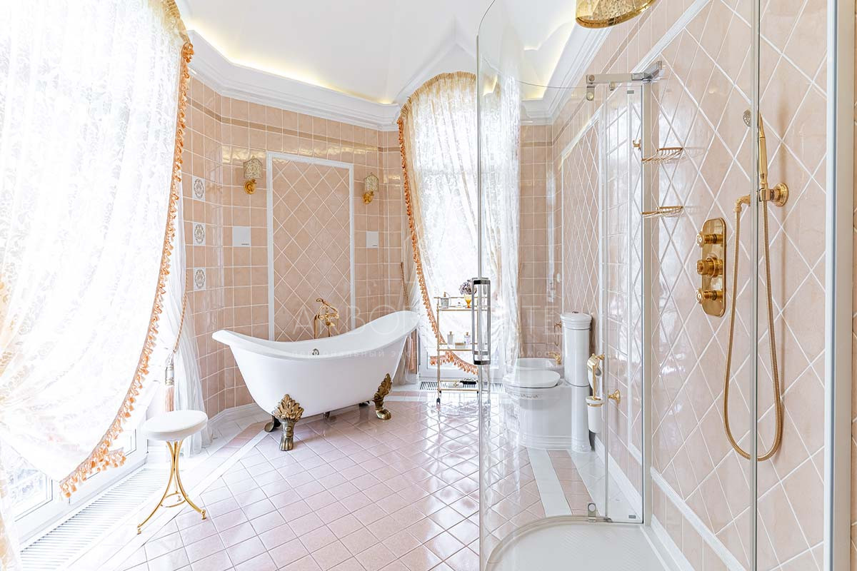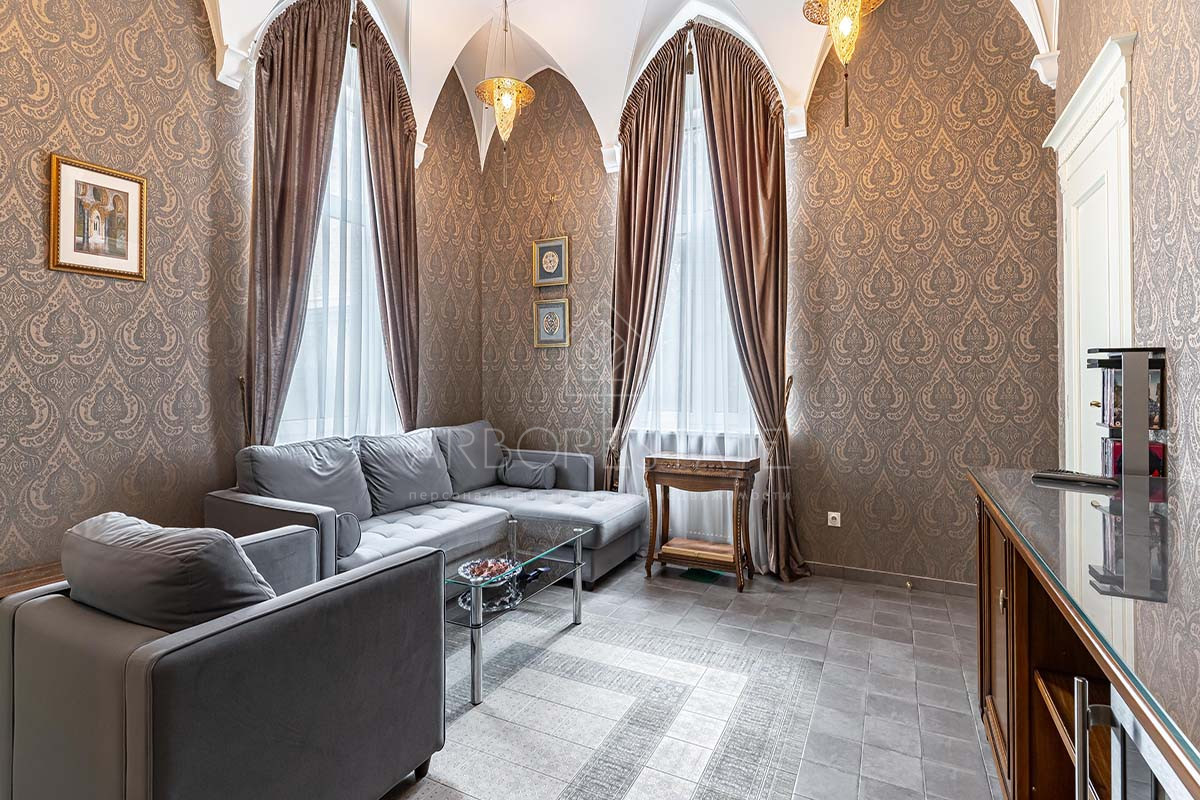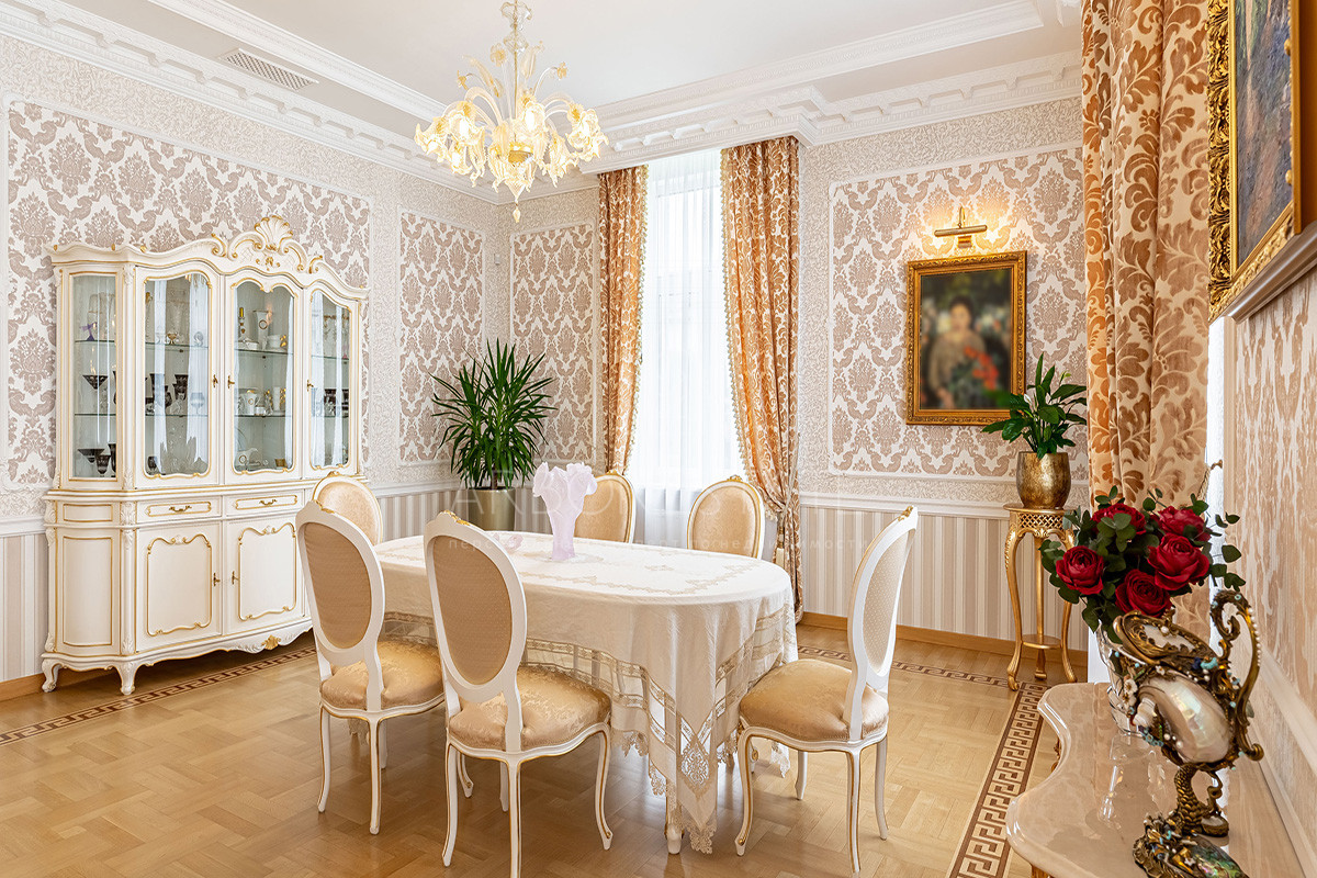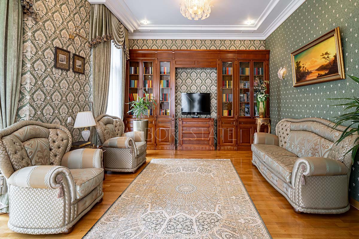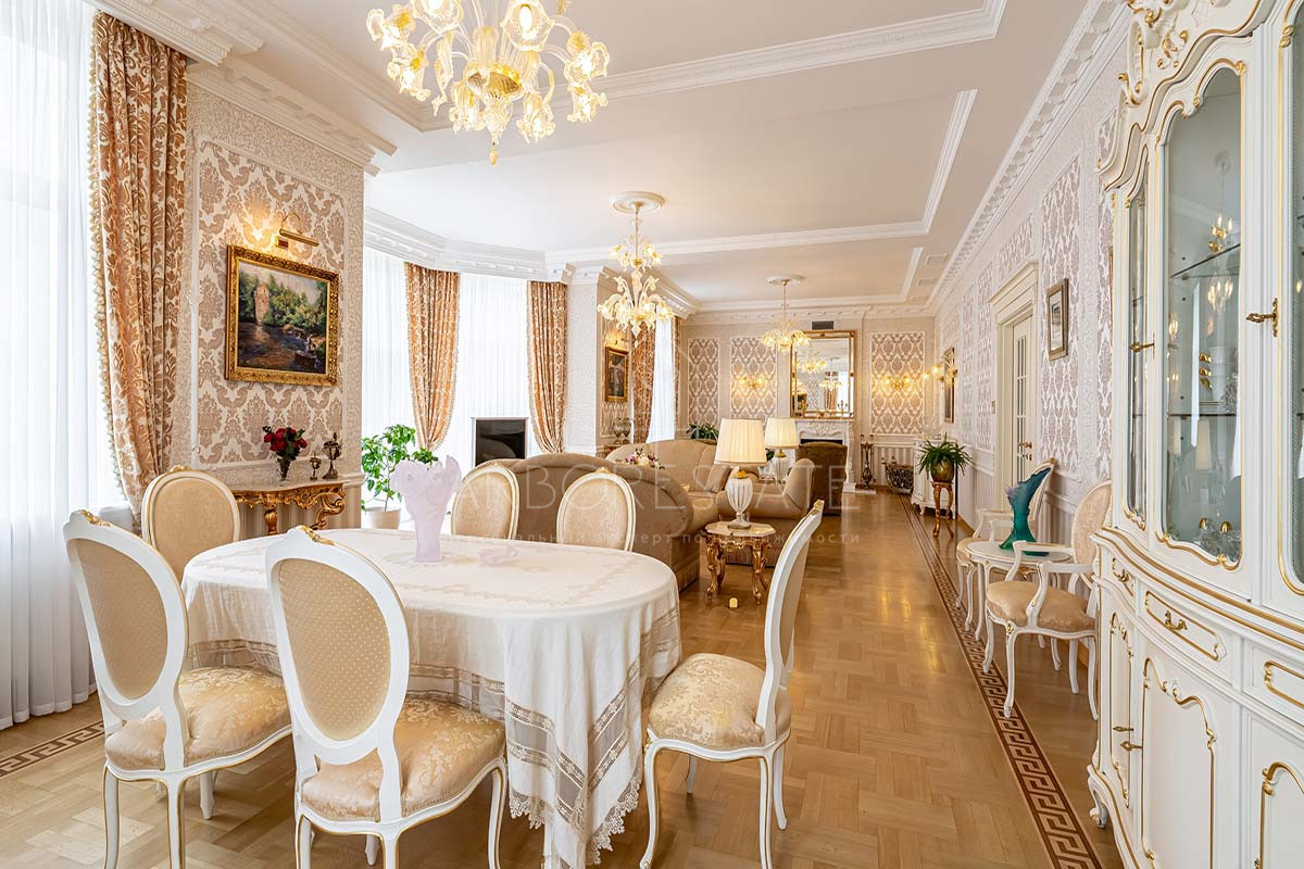 Шикарный интерьер дополнен изысканной мебелью и предметами декора. Большая площадь остекления и высокие потолки визуально увеличивают внутреннее пространство.