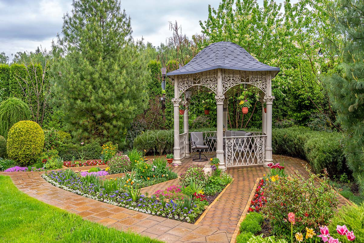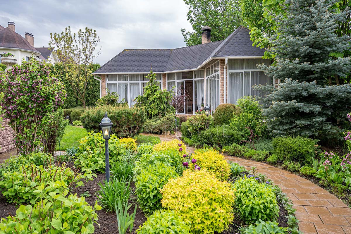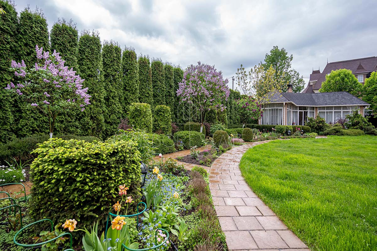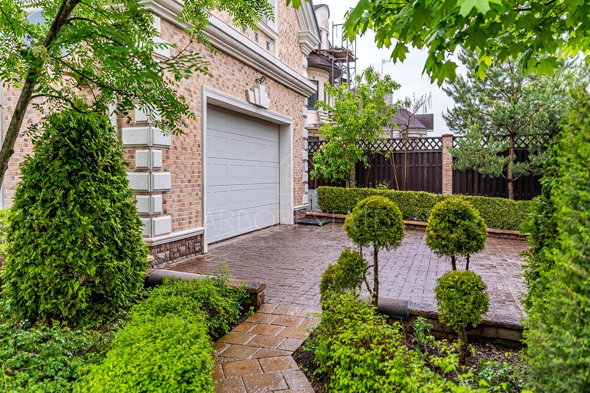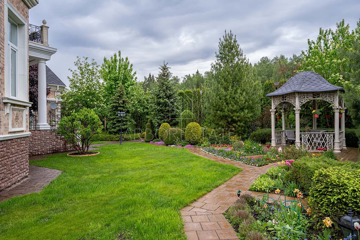 Участок буквально утопает в зелени, среди которой уютно расположена летняя беседка. Вдоль забора растут туи, создающие приватную атмосферу и скрывающие участок от взглядов прохожих.