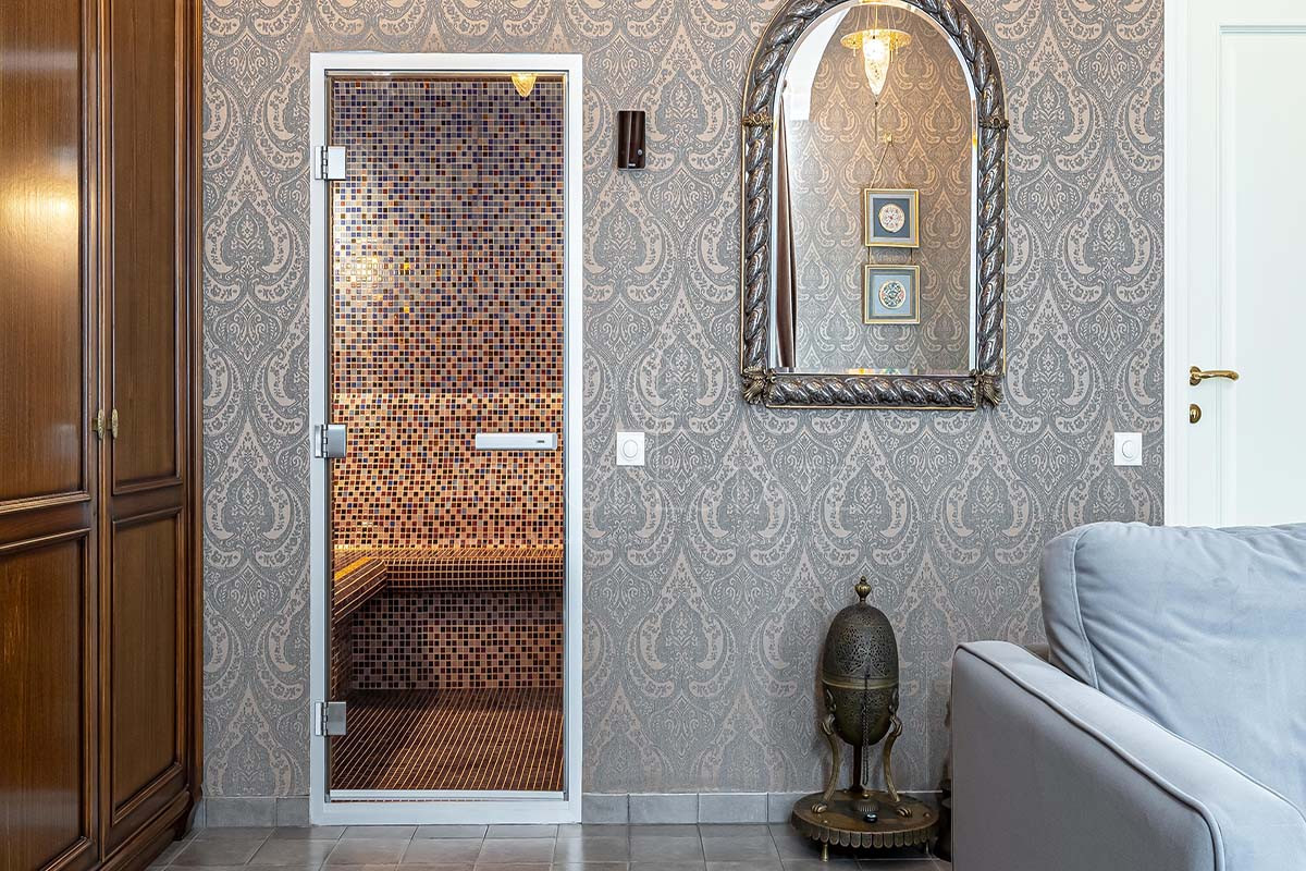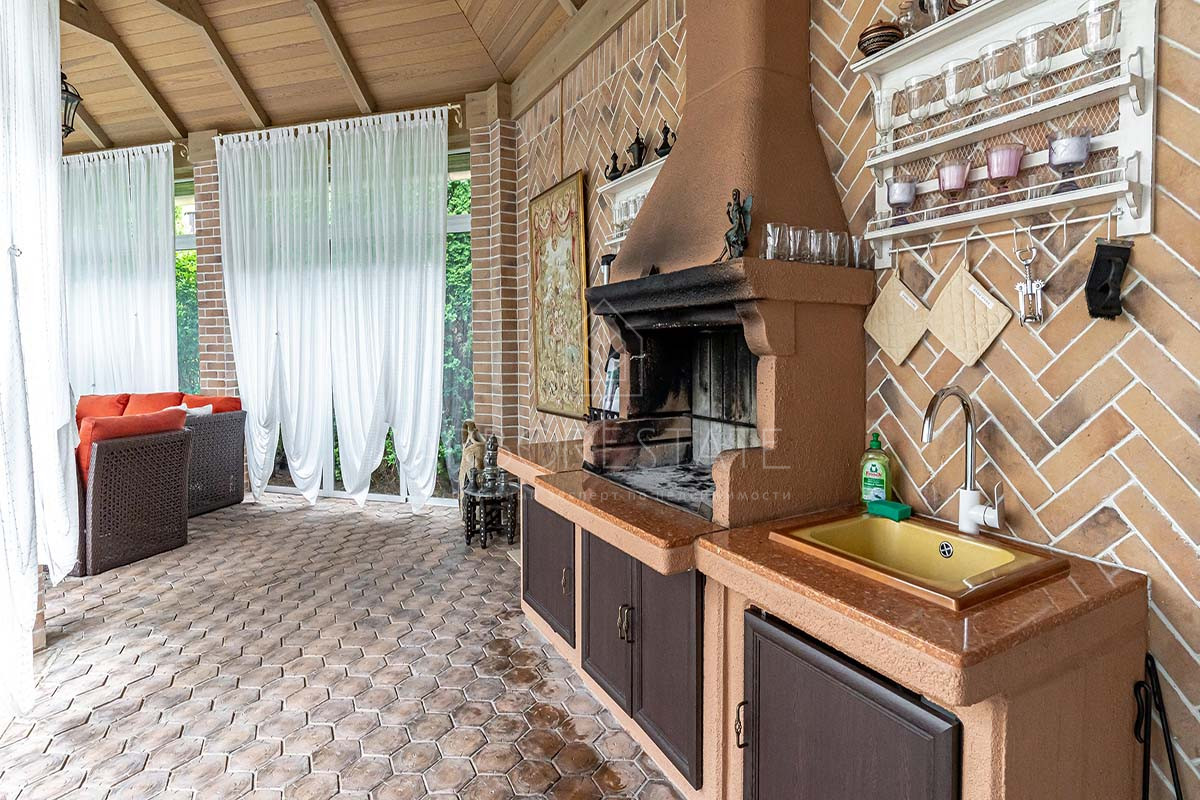 На первом этаже: холл, гардероб, кухня-столовая, просторная гостиная с камином и выходом на террасу, 2 санузла, спортзал, СПА-зона с хаммамом.