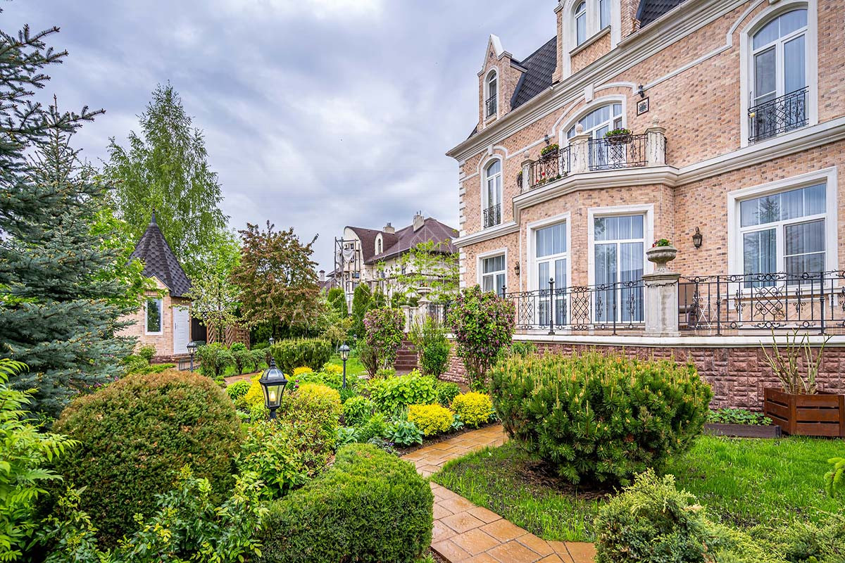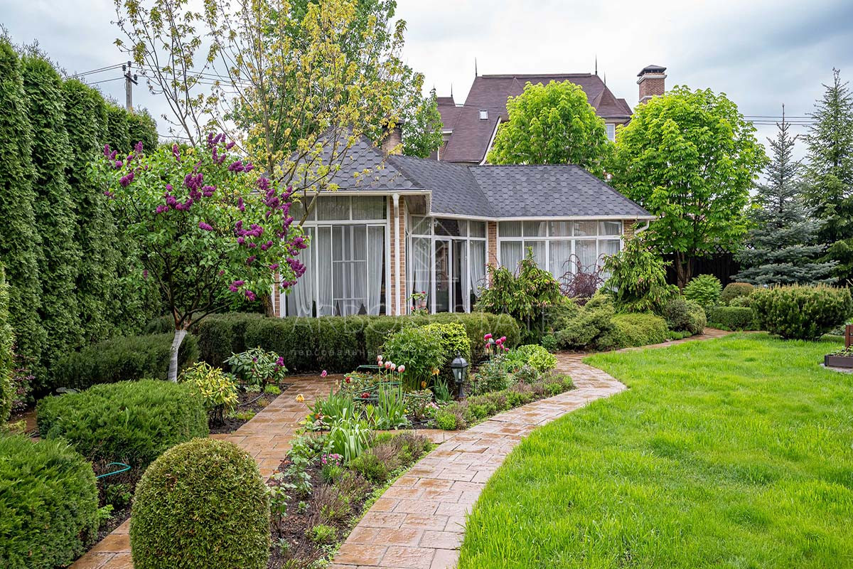 На участке выполнен великолепный ландшафтный дизайн: аккуратно уложен газон, сделаны дорожки и уличное освещение, растут взрослые деревья. Имеется даже небольшой собственный пруд. Построен гараж для 2-х автомобилей на втором этаже которого расположена квартира для помощников по хозяйству.