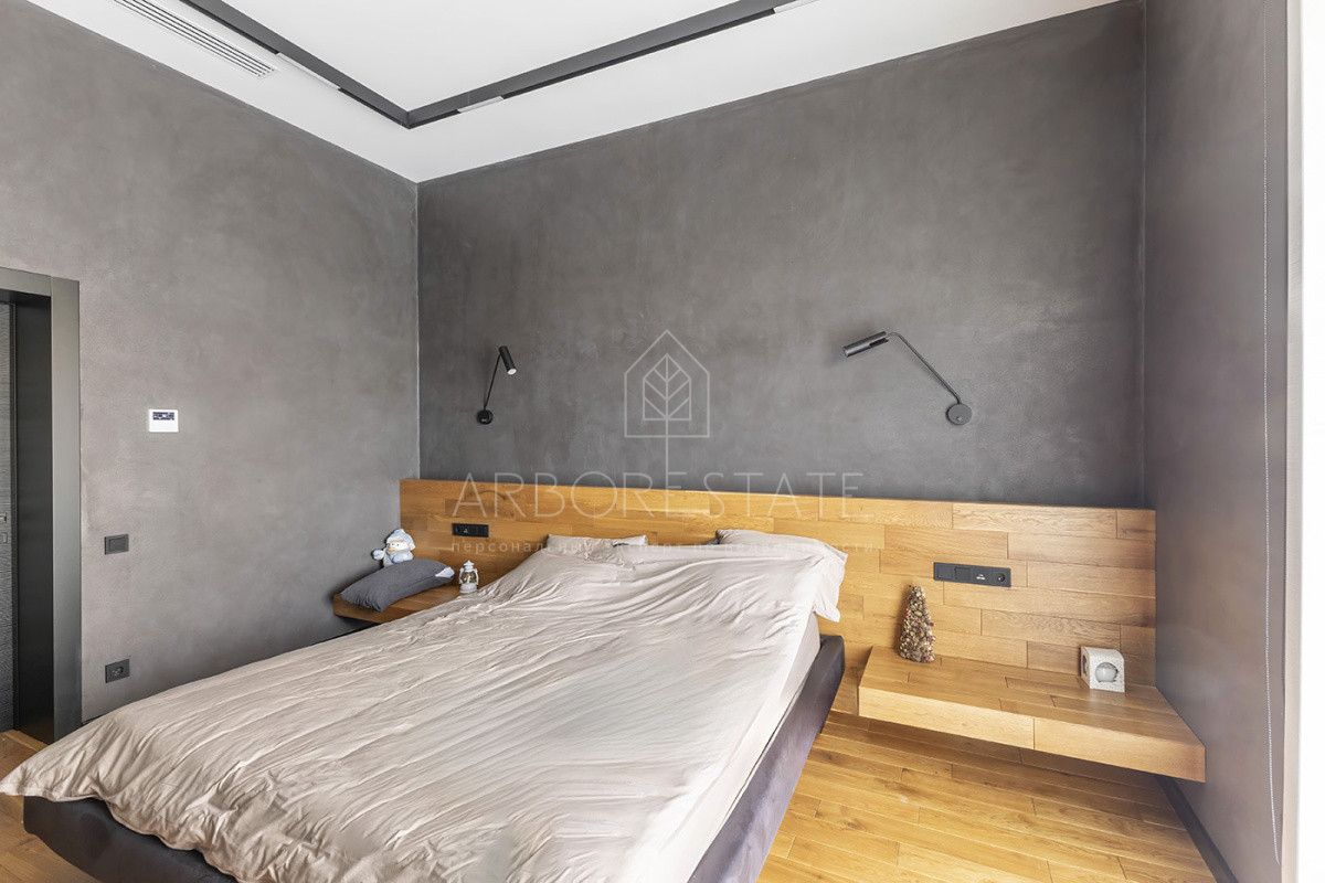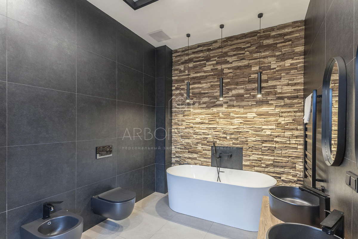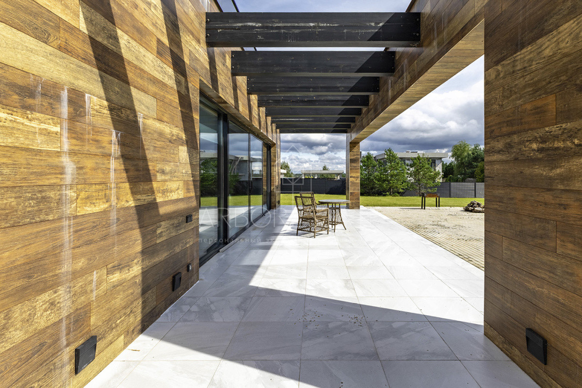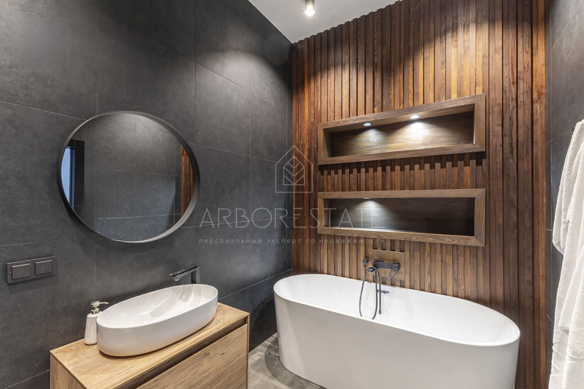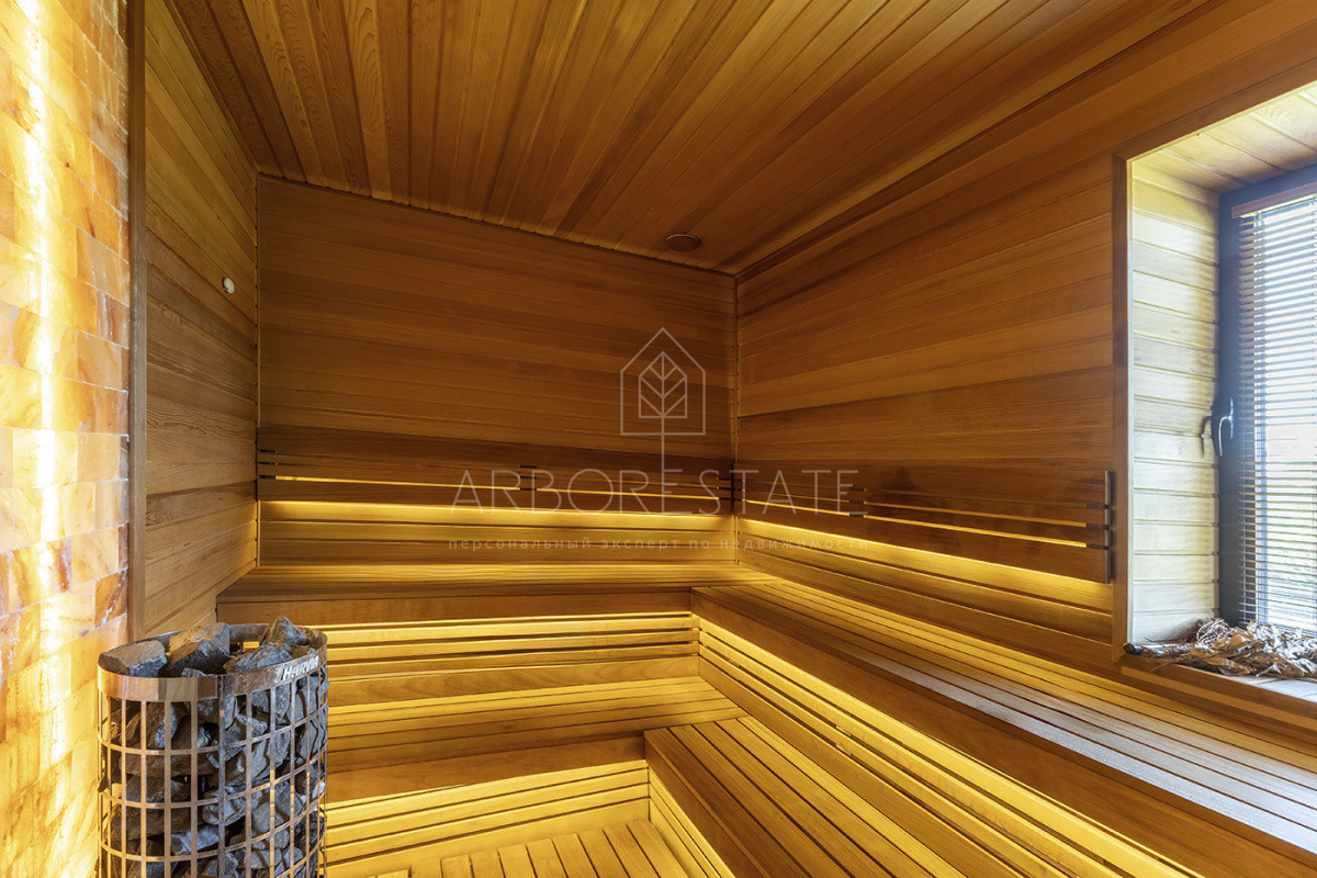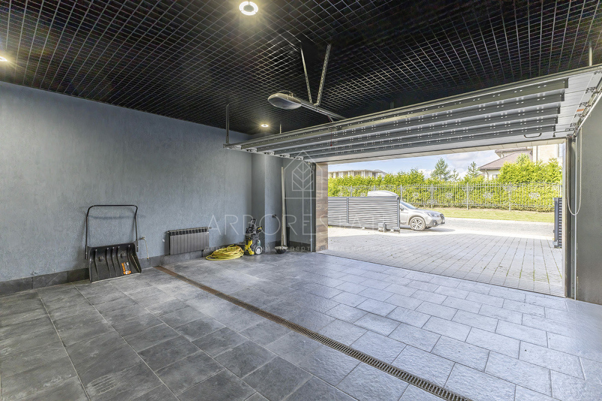 В доме высокие потолки 3,7 метра, гостиная более 100кв.м с камином, в отделке преобладают ценные породы древесины и керамогранит.