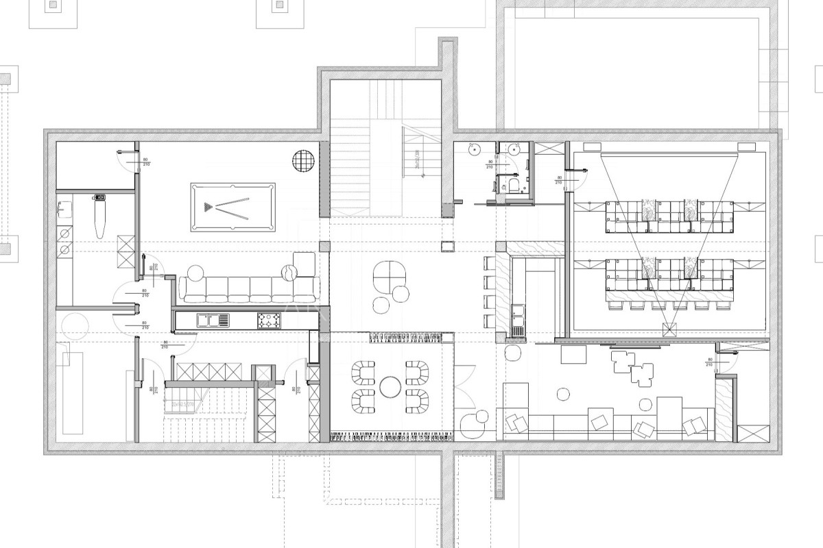 Цоколь: кинотеатр, бильярдная, бар, винный погреб, рабочая кухня,