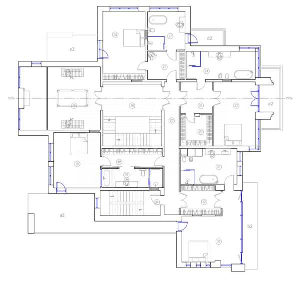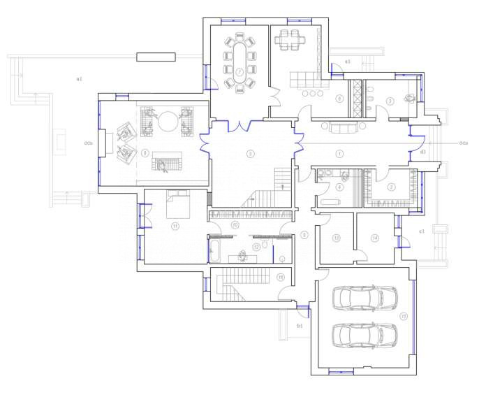Планировка продумана до мелочей: на первом уровне встречает просторный холл с мраморными полами, ведущий в элегантную гостиную-салон с камином и выходом на террасу, кухню-столовую с техникой премиального бренда Kuppersbusch, гостевая спальня с гардеробной и санузлом, постирочная и серверная, гараж на 2 автомобиля. Второй этаж отведен под приватную зону — здесь расположена мастер-спальня с гардеробной и ванной комнатой, три спальни со своими гардеробными и санузлами и игровая комната.