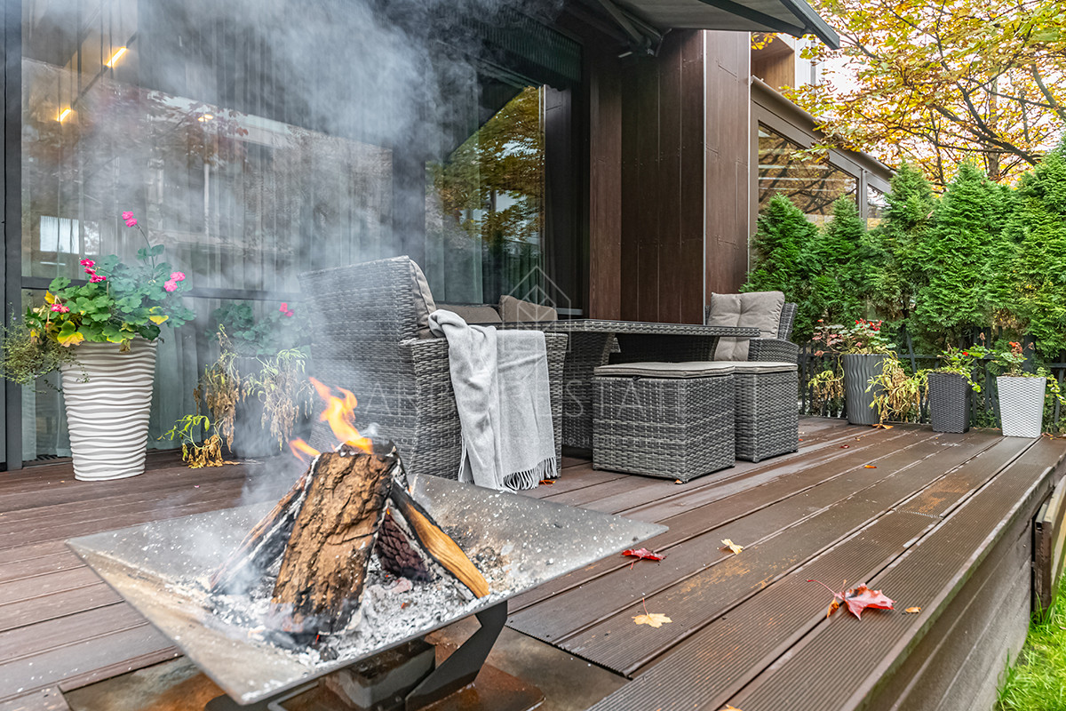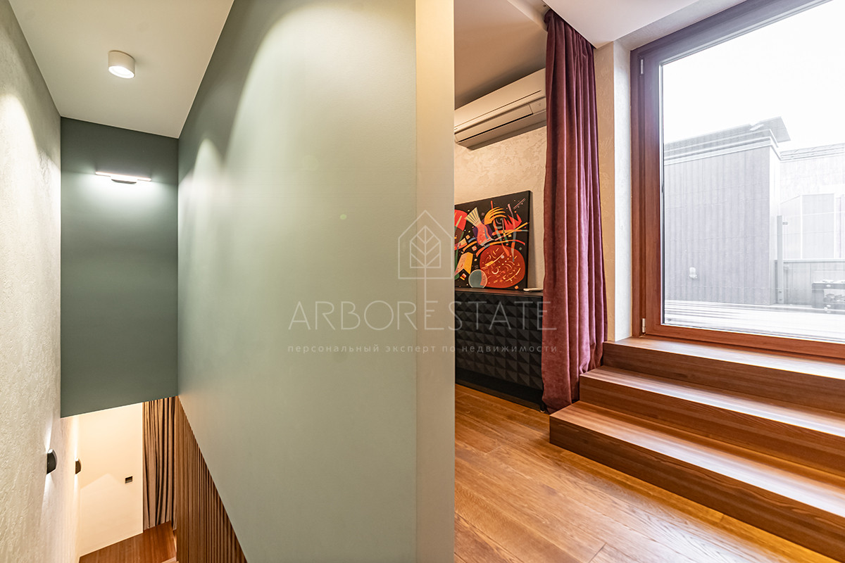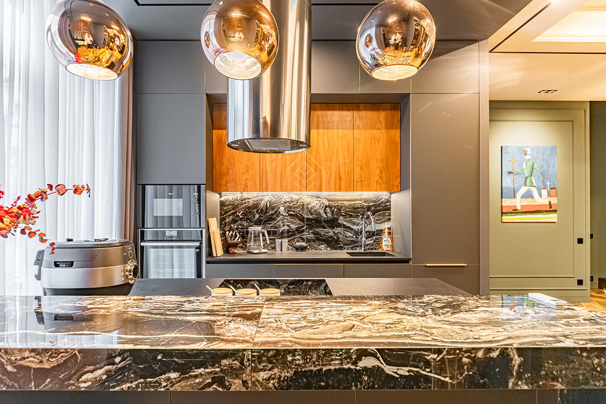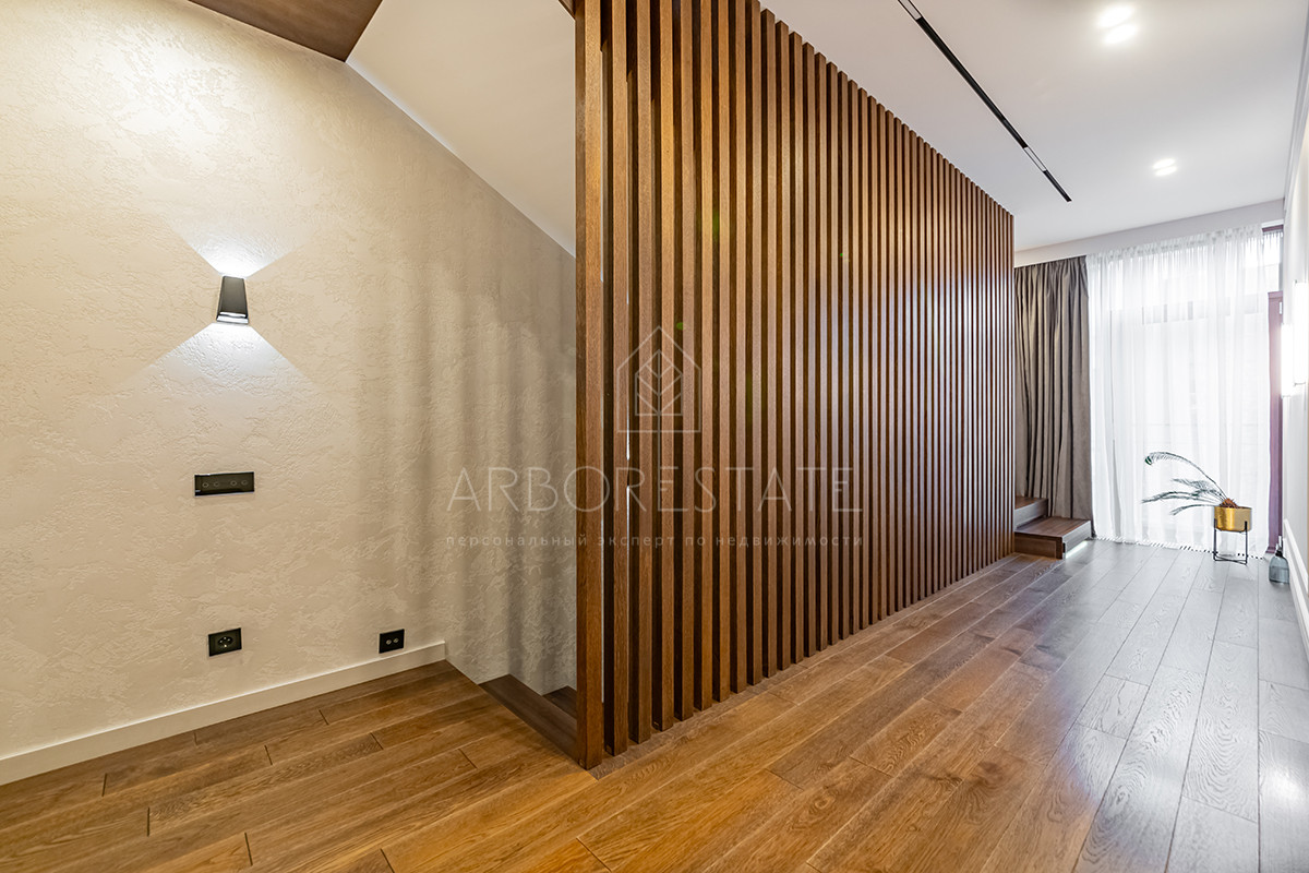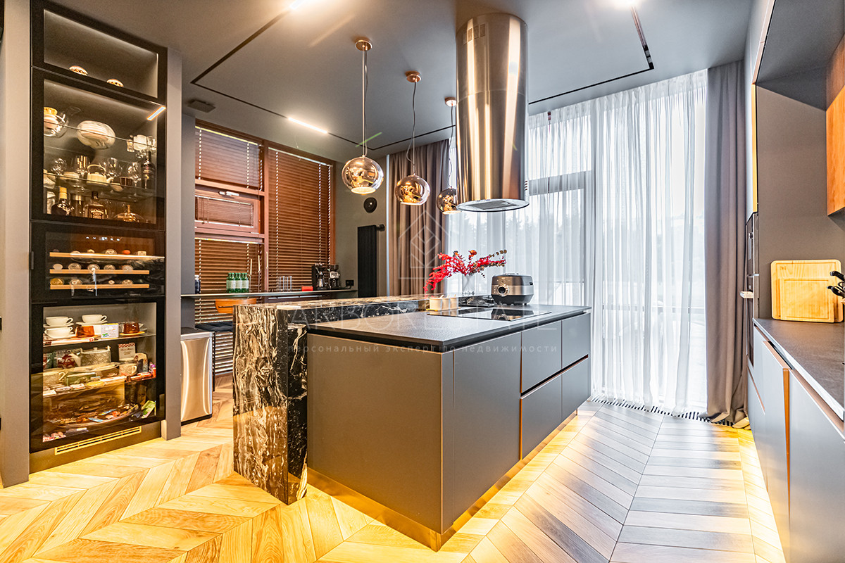 Выполнен дизайнерский ремонт из качественных материалов: отделка стен - дубовый шпон, керамогранит Италия, столешница из вулканической лавы, облицовка камина выполнена из цельного слэба натурального камня.