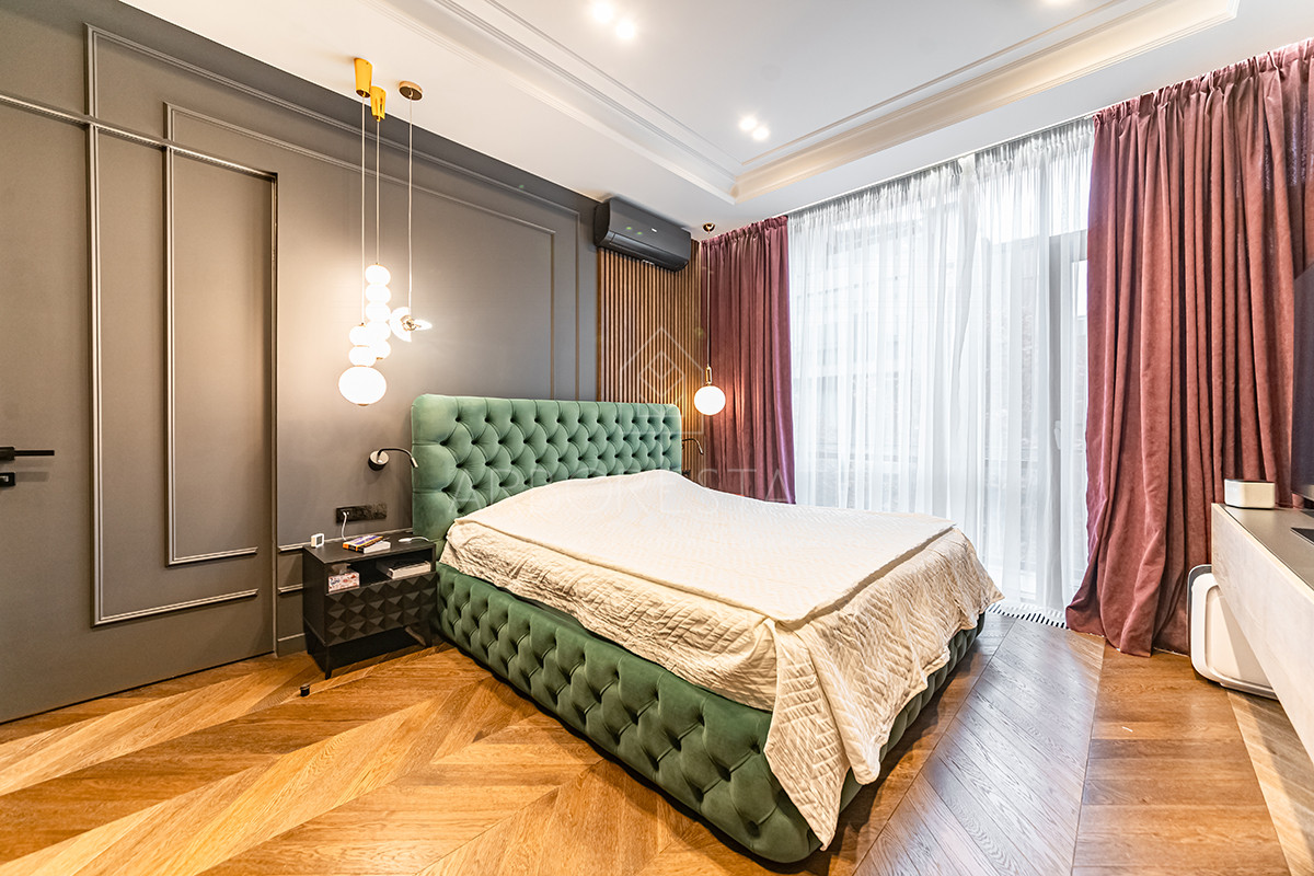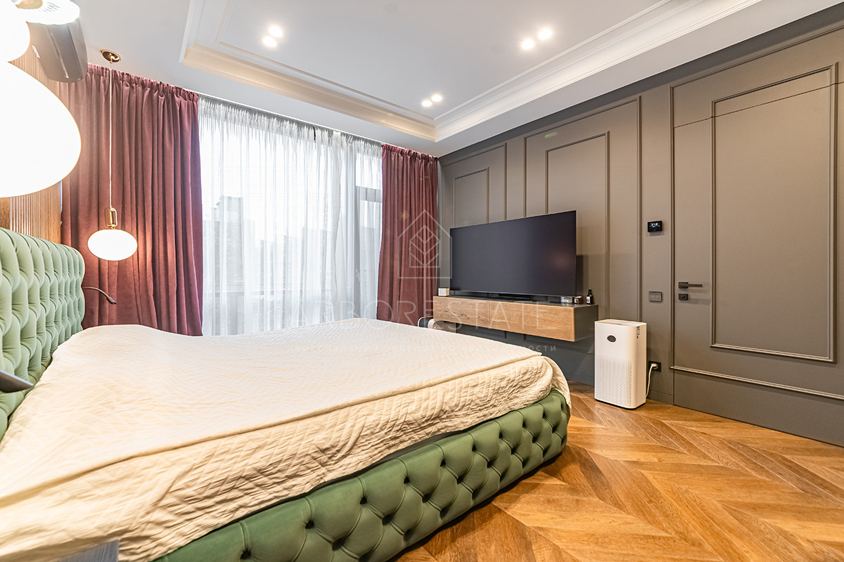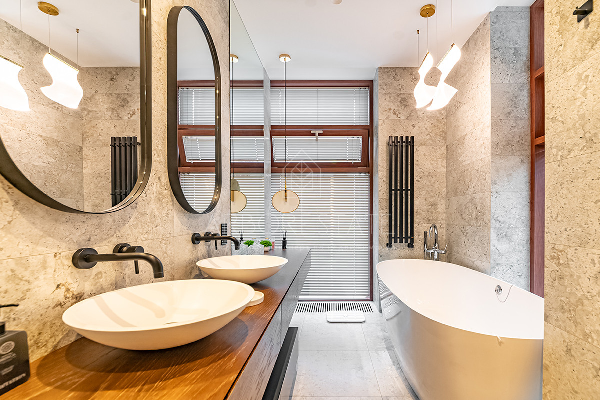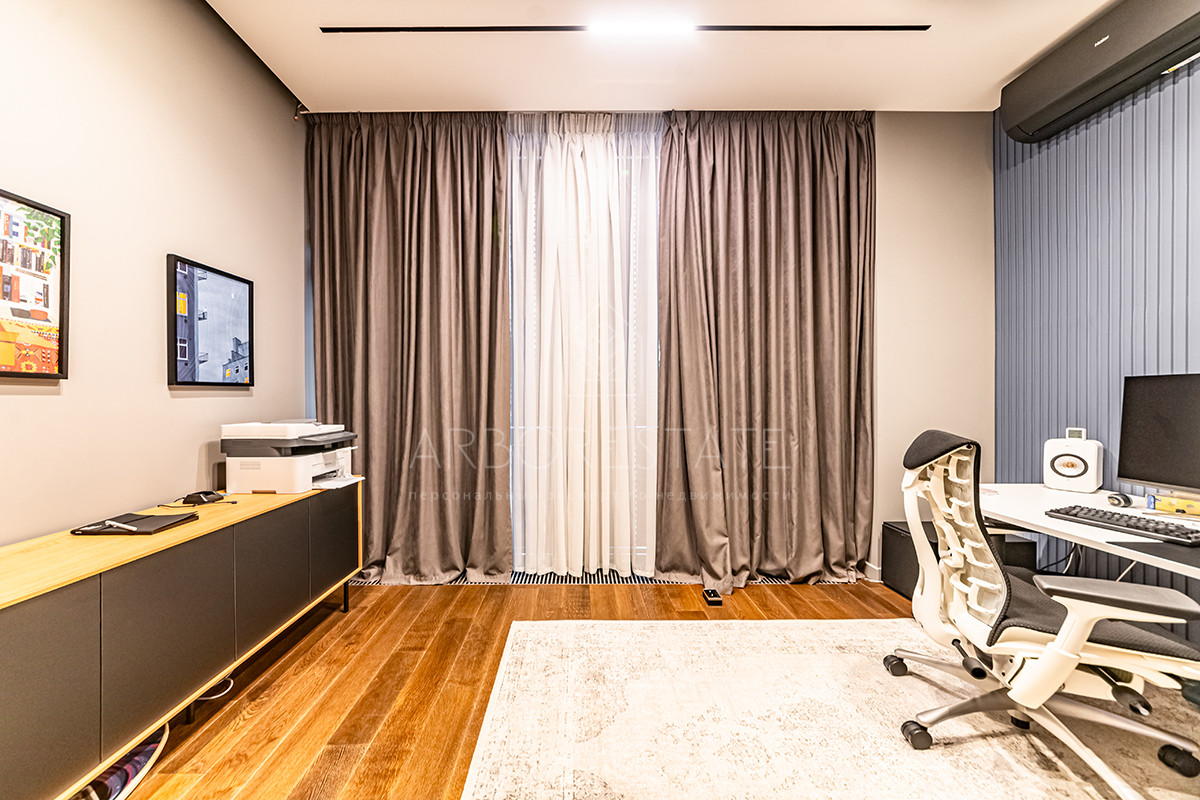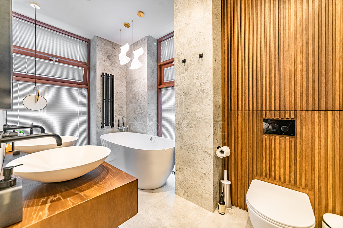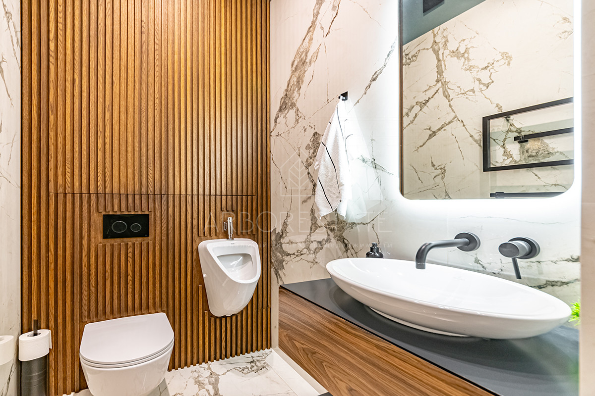 Выполнен дизайнерский ремонт из качественных материалов: отделка стен - дубовый шпон, керамогранит Италия, столешница из вулканической лавы, облицовка камина выполнена из цельного слэба натурального камня.