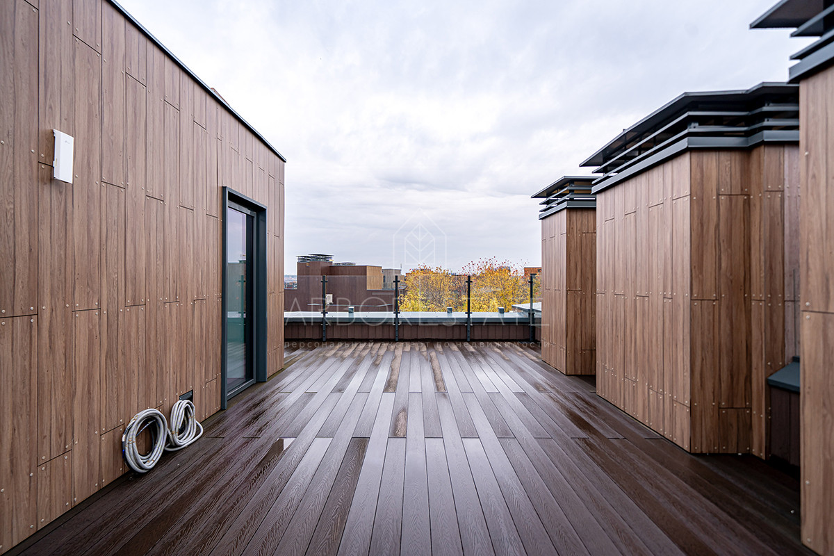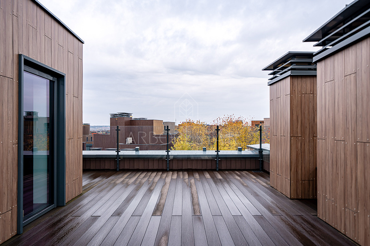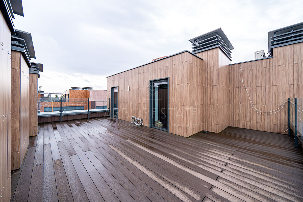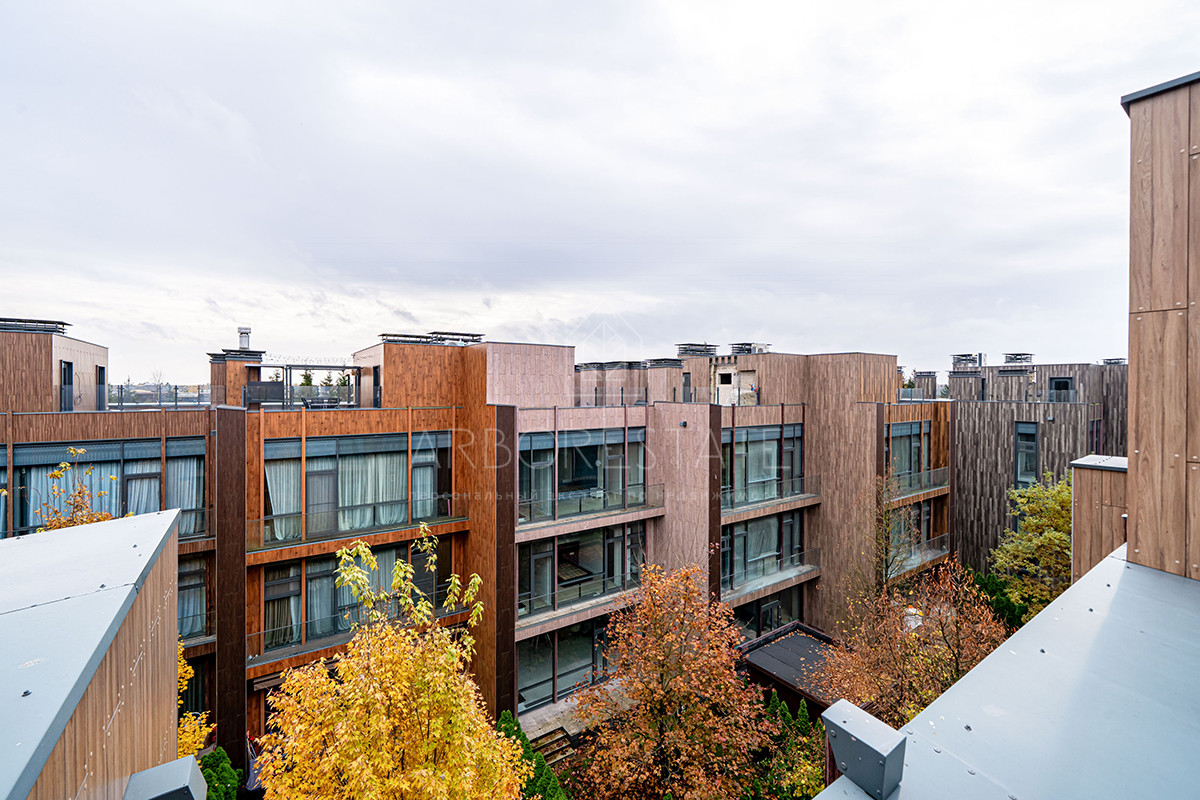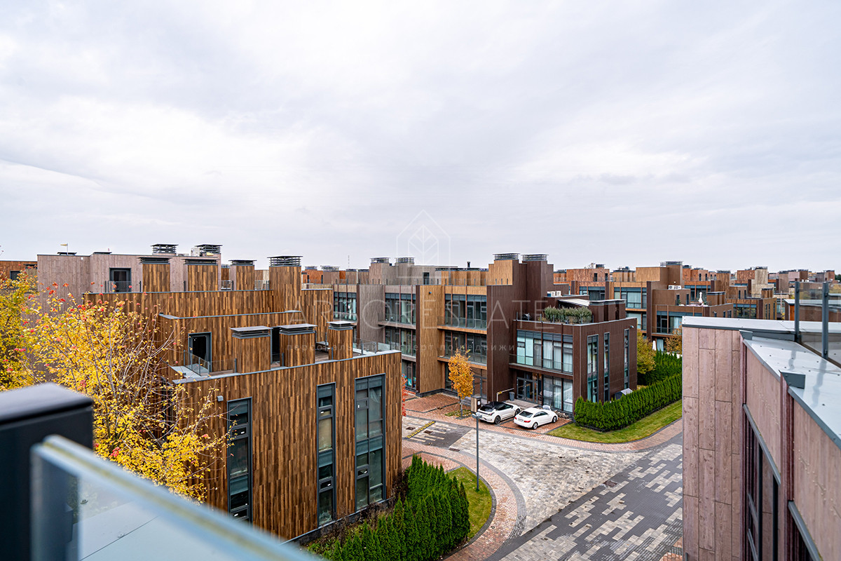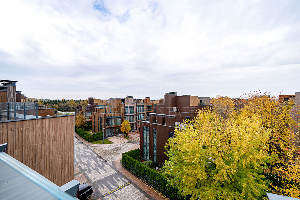 Площадь таунхауса 239 м2. Помещения распределены в 3 уровнях. Планировка предлагает гостиную-столовую-кухню в едином открытом пространстве, 4 спальни, 4 санузла.