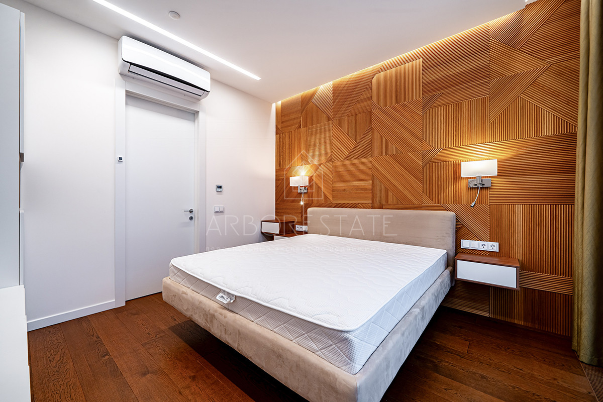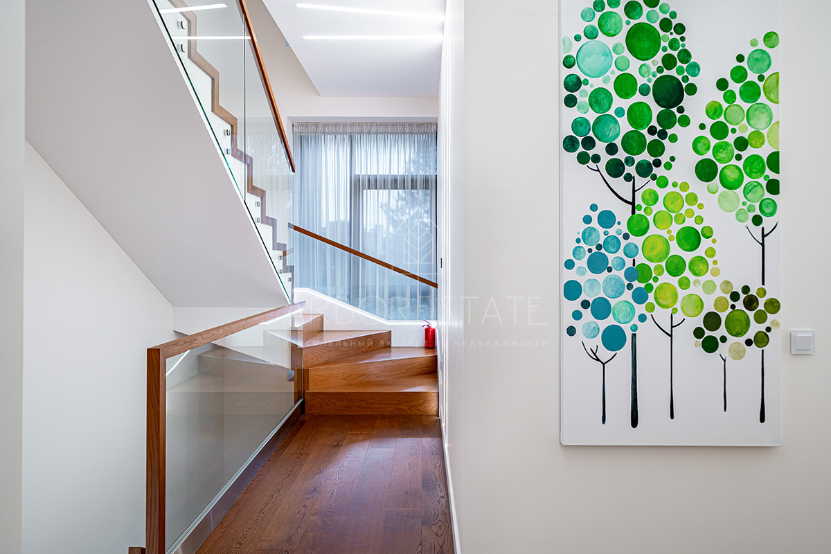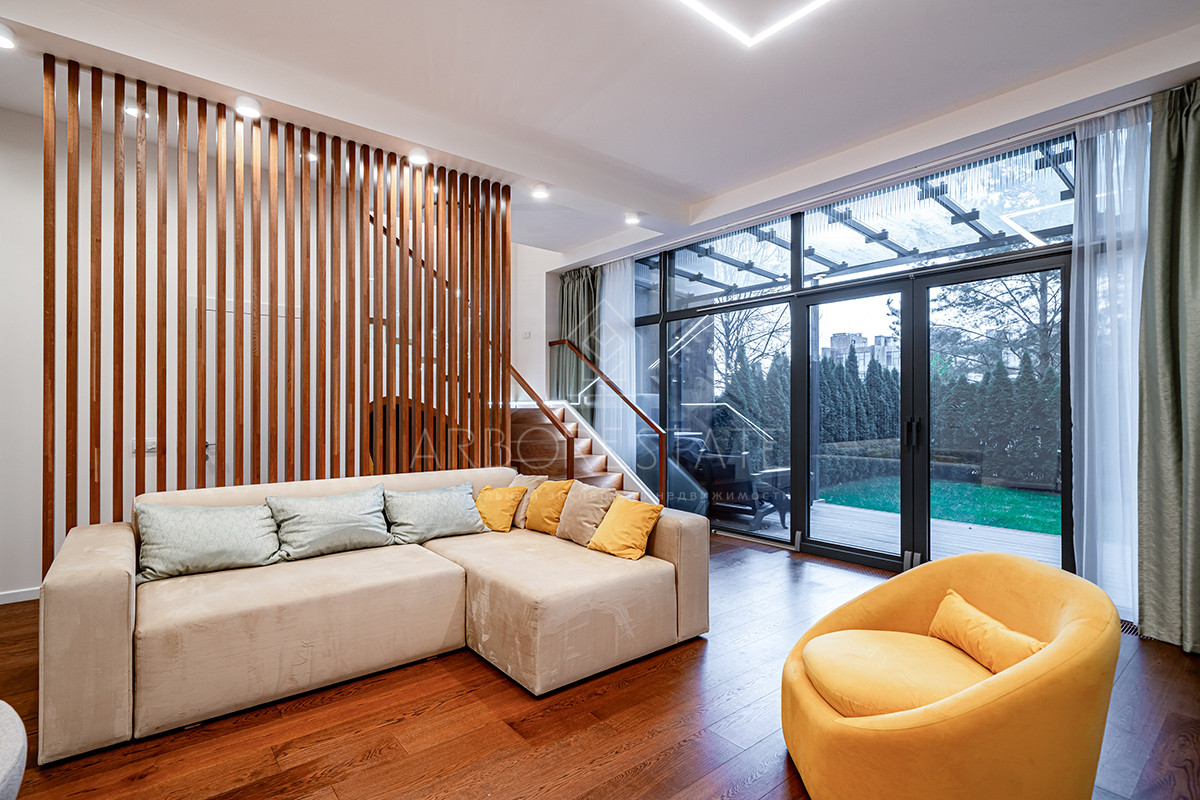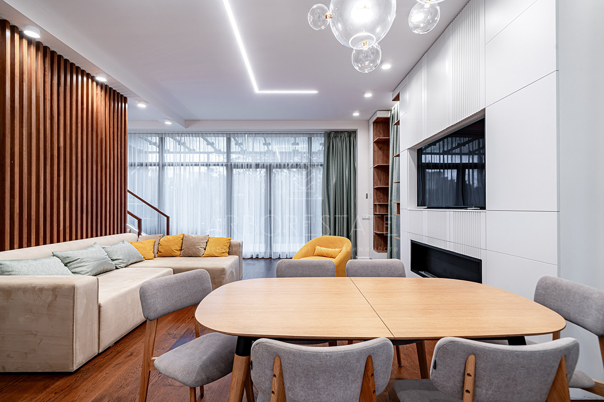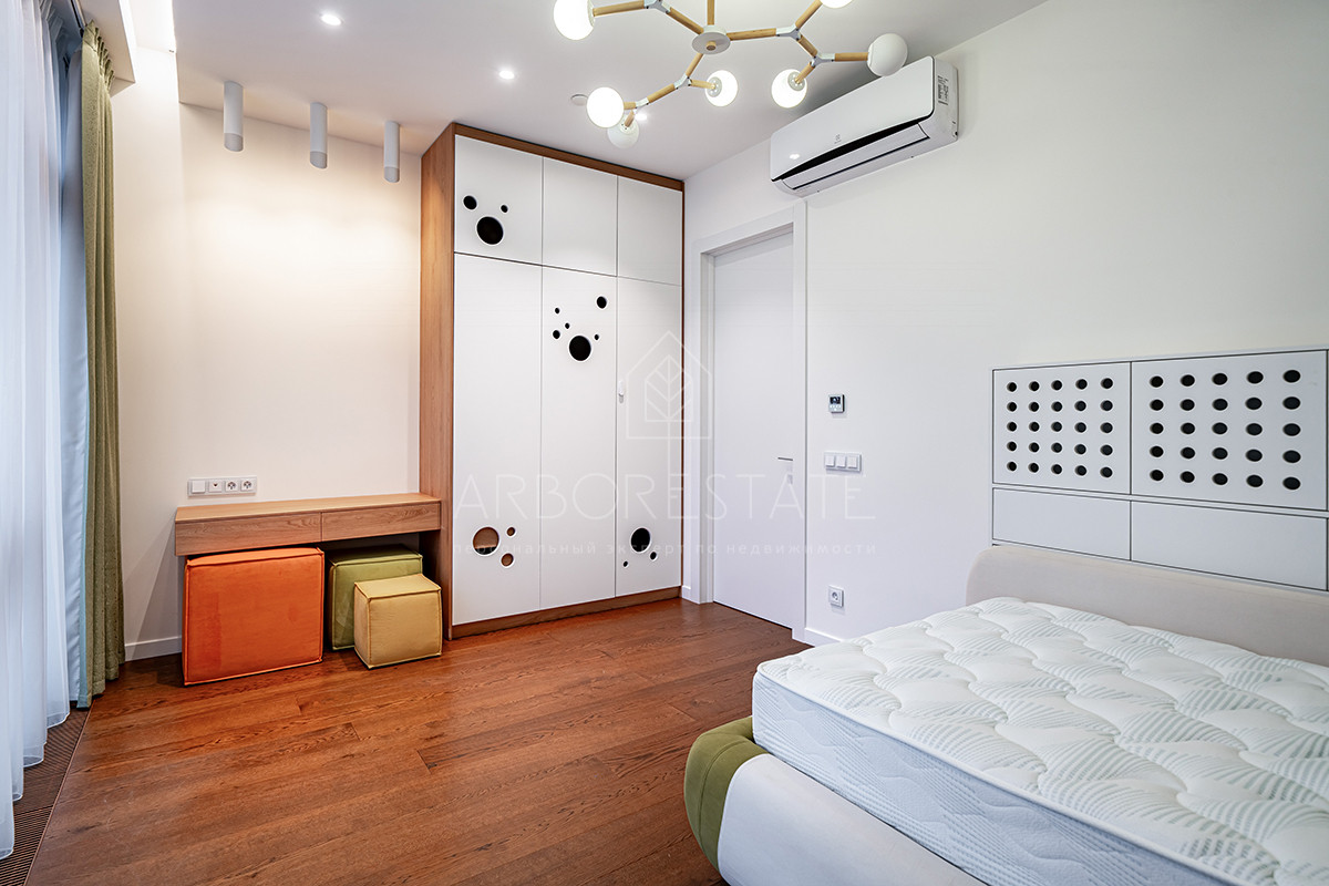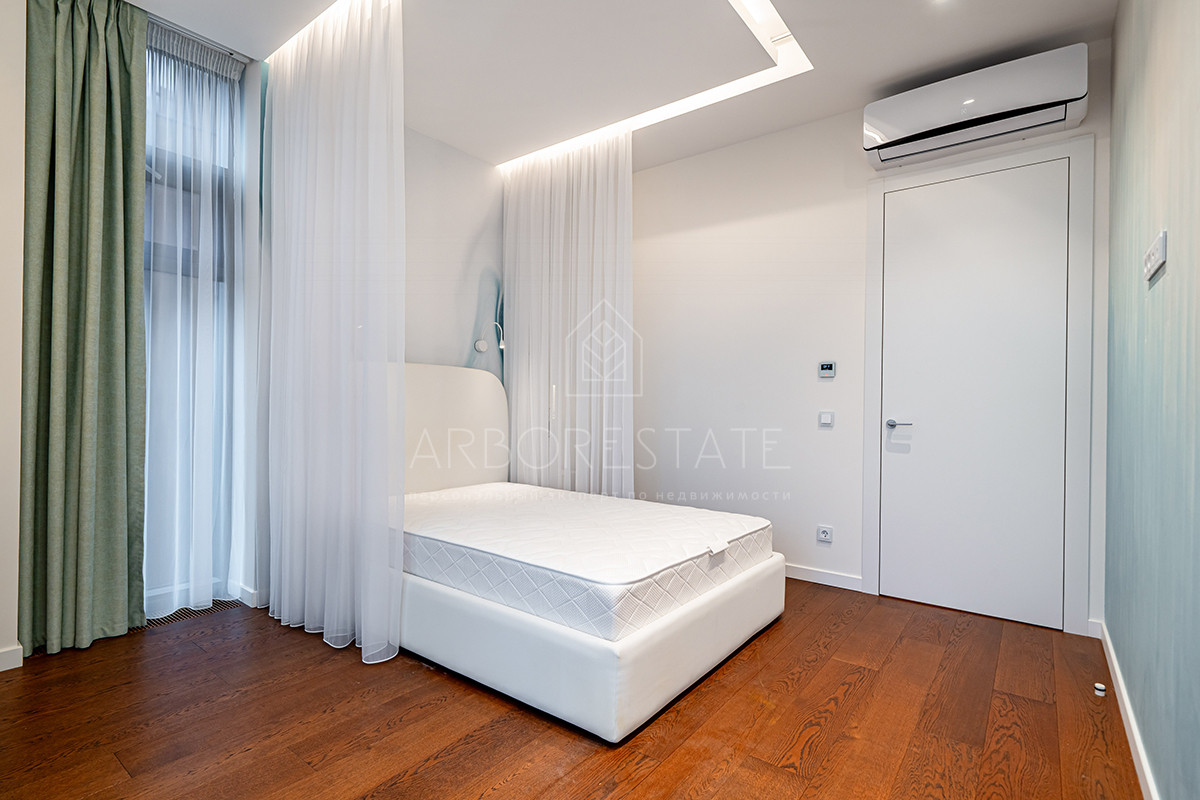 Планировка: просторная гостиная, кухня-столовая с выходом в приватную часть участка, 4 спальных комнаты (мастер спальня, 2 спальни с гардеробной комнатой, спальня с санузлом). Установлен гидравлический лифт. Таунхаус оснащен премиальной встроенной техникой. Отделка выполнена из дорогостоящих высококачественных материалов.