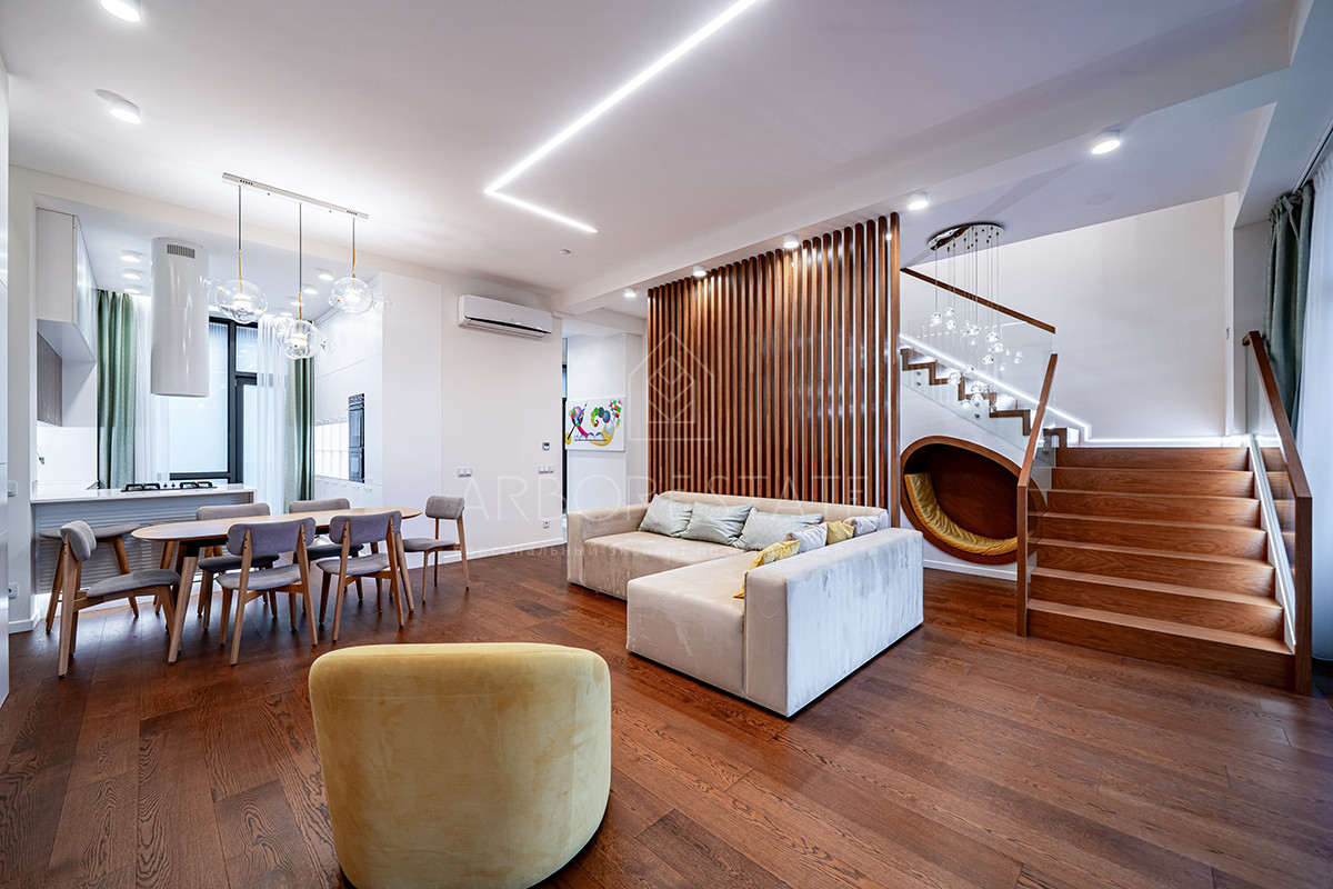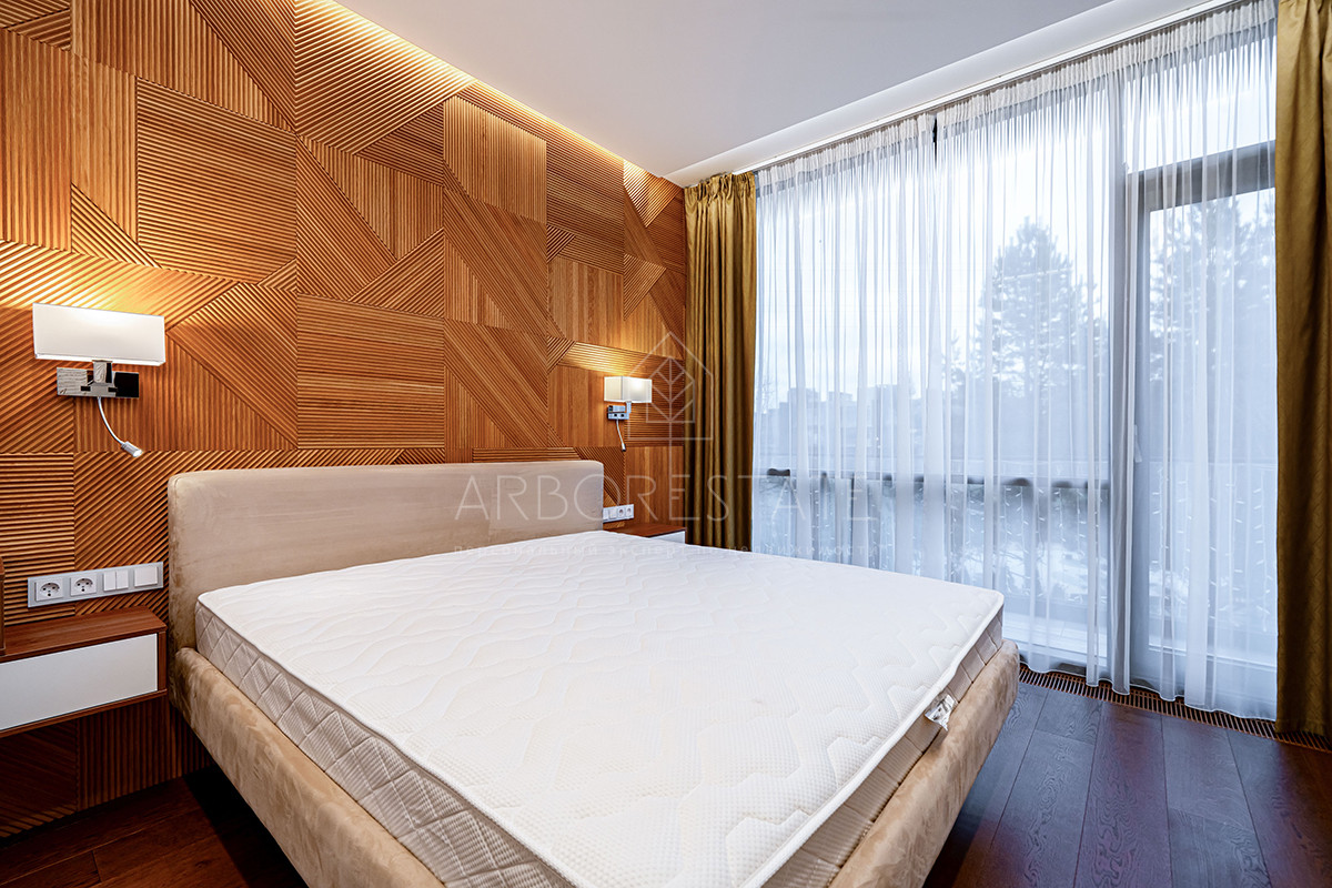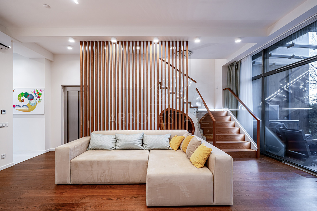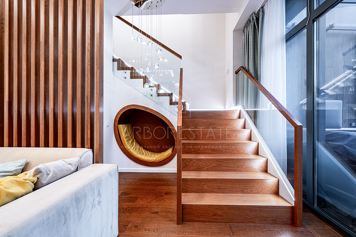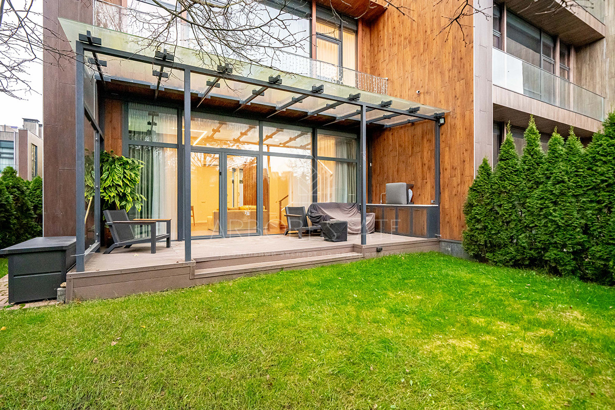 Планировка: просторная гостиная, кухня-столовая с выходом в приватную часть участка, 4 спальных комнаты (мастер спальня, 2 спальни с гардеробной комнатой, спальня с санузлом). Установлен гидравлический лифт. Таунхаус оснащен премиальной встроенной техникой. Отделка выполнена из дорогостоящих высококачественных материалов.