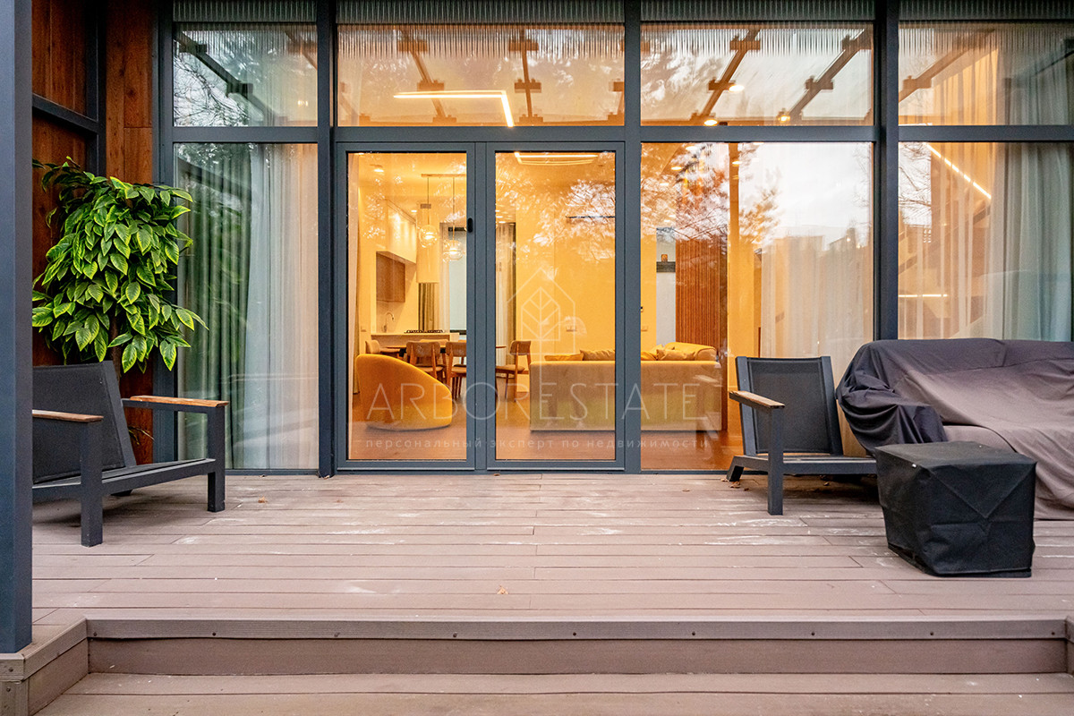 Кабинет - лаундж зона с дровяным камином и открывающейся перголой. Задний двор оборудован кухней и стеклянной верандой