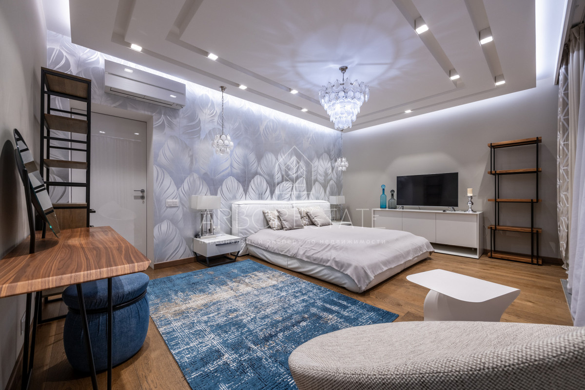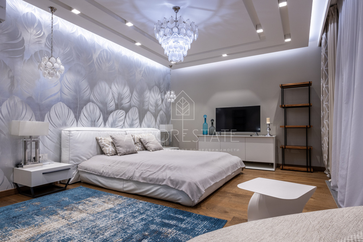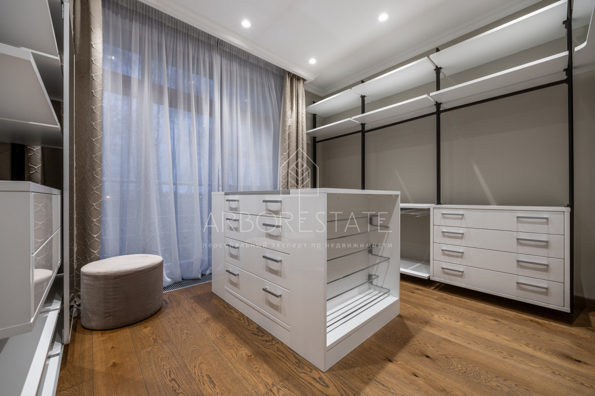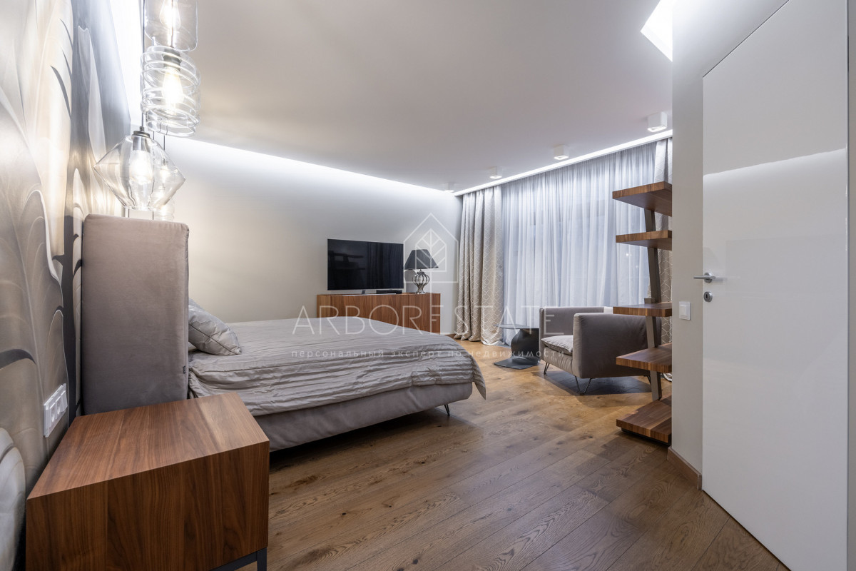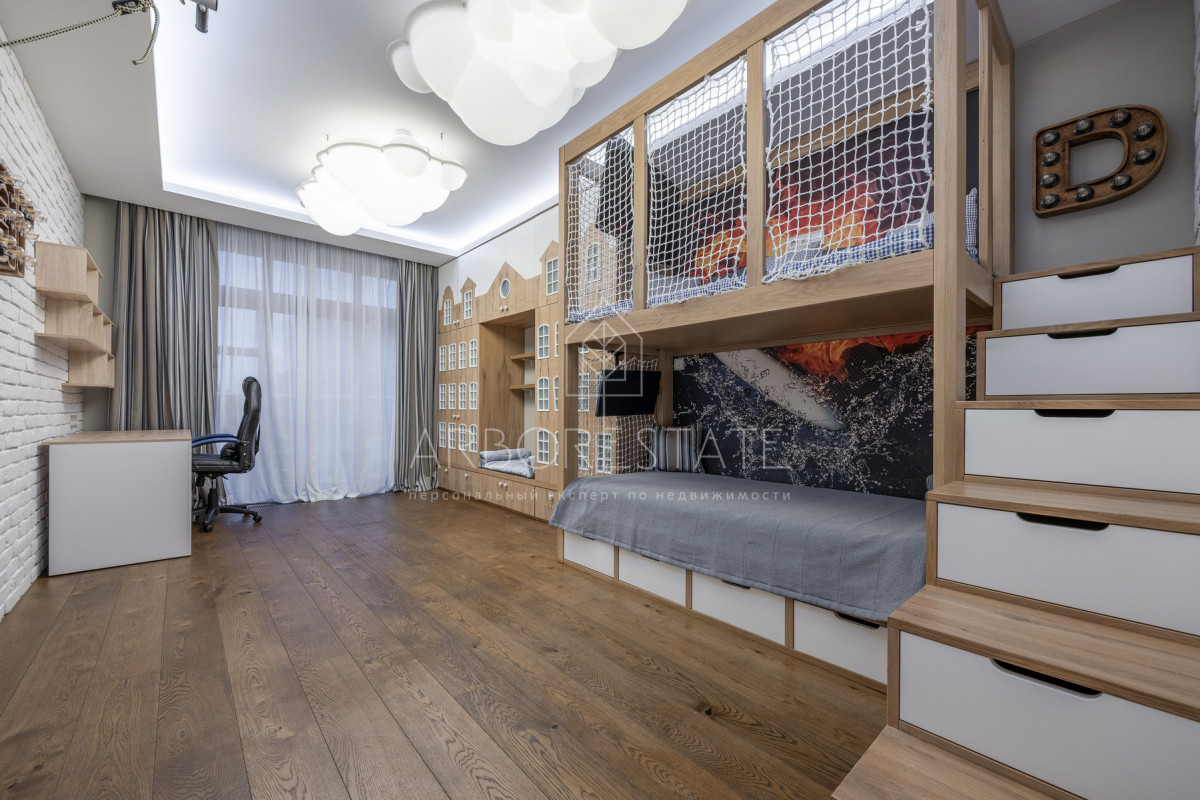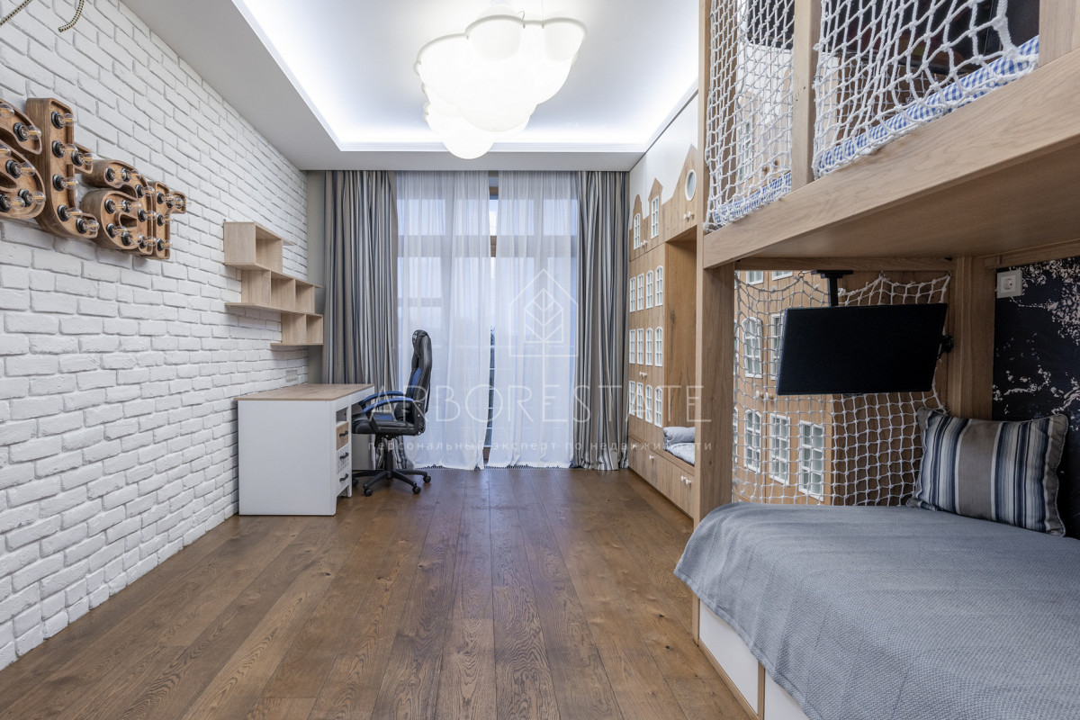 На втором этаже: холл, мастер-спальня с гардеробной комнатой, ванная комната с душевой кабиной и ванной, детская спальня с рабочей зоной и диваном для отдыха и чтения, встроенным гардеробом, гостевая спальня (комната няни).