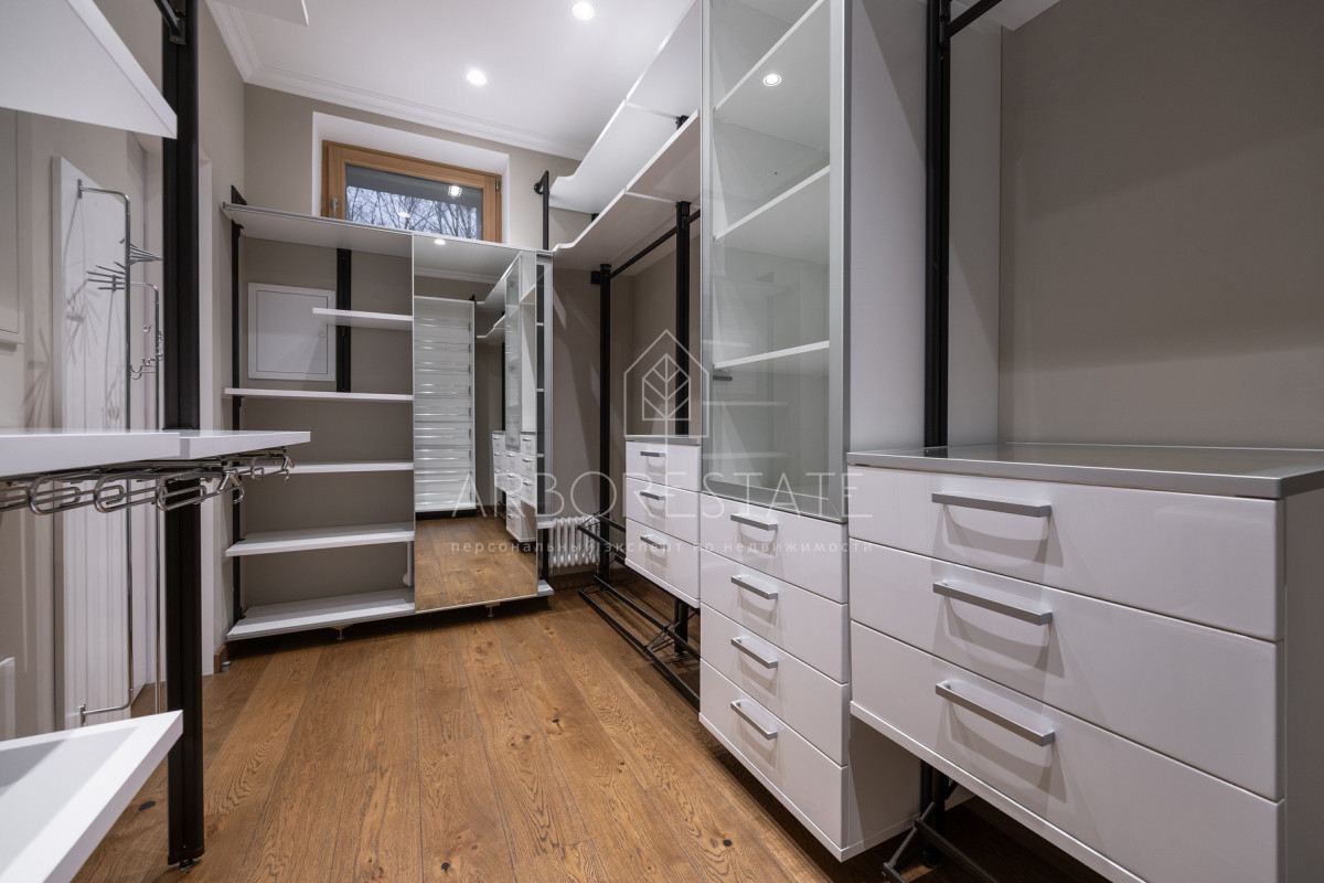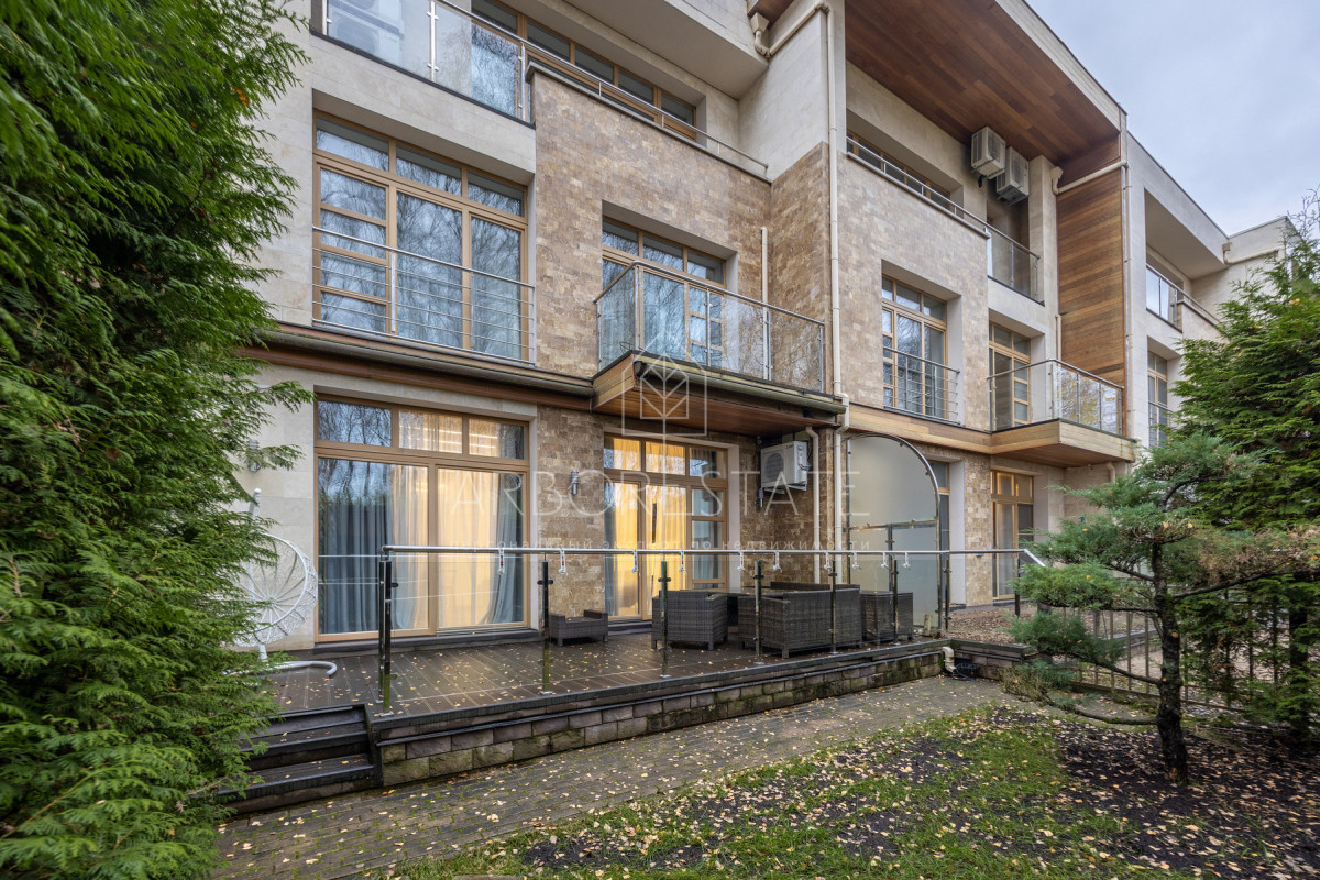 На первом этаже: прихожая со встроенным гардеробом, гостевой санузел, гостиная с дровяным камином, кухня, столовая с выходом на террасу в приватную часть участка, постирочная со стиральной и сушильной машинами, кладовая для хранения под лестницей, котельная с установленной системой водоподготовки. С фасадной части таунхауса вход в пространство для хранения инвентаря, покрышек и при необходимости парковки мотоцикла.
